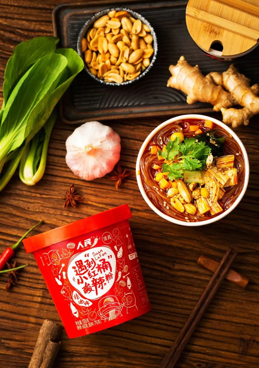 1.人民遇到小红桶酸辣粉,粉饼成分只有红薯淀粉和食用盐,不含添加剂香精、不含木薯淀粉干净简单,纯红薯粉 美味过瘾,纯红薯粉煮后晶莹剔透,口感Q弹,味感层次丰富,入口爽滑,酸辣爽口;