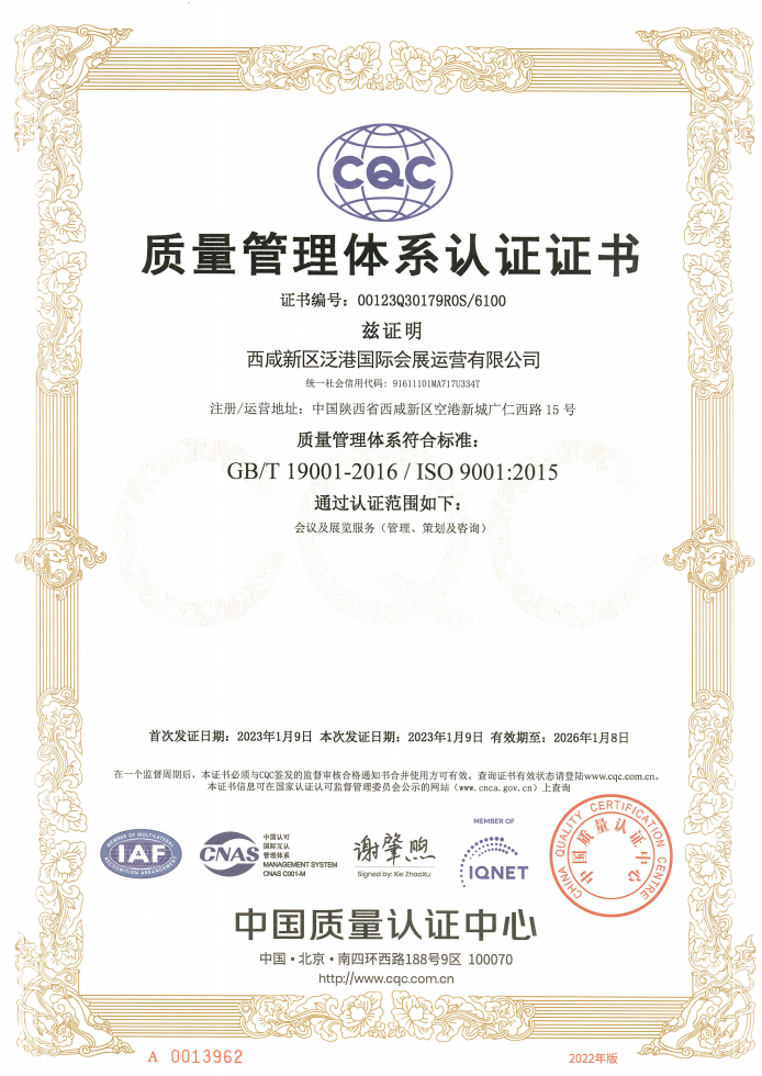 同月,经中国质量认证中心认证,获得ISO9001(质量管理体系)、ISO14001(环境管理体系)、ISO45001(职业健康安全管理体系)三体系认证,标志着西安临空会展中心标准化、专业化运营水平再上新台阶!