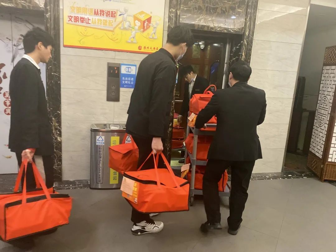 1月21日(除夕)温州大酒家员工正在运送年夜饭外卖套餐。