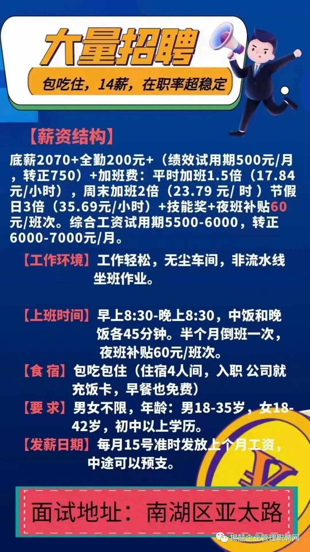 招募年龄:18—45岁,男女不限,长白班,包吃工作餐,住宿自理,民族不限,可以预支,每月月底发工资
