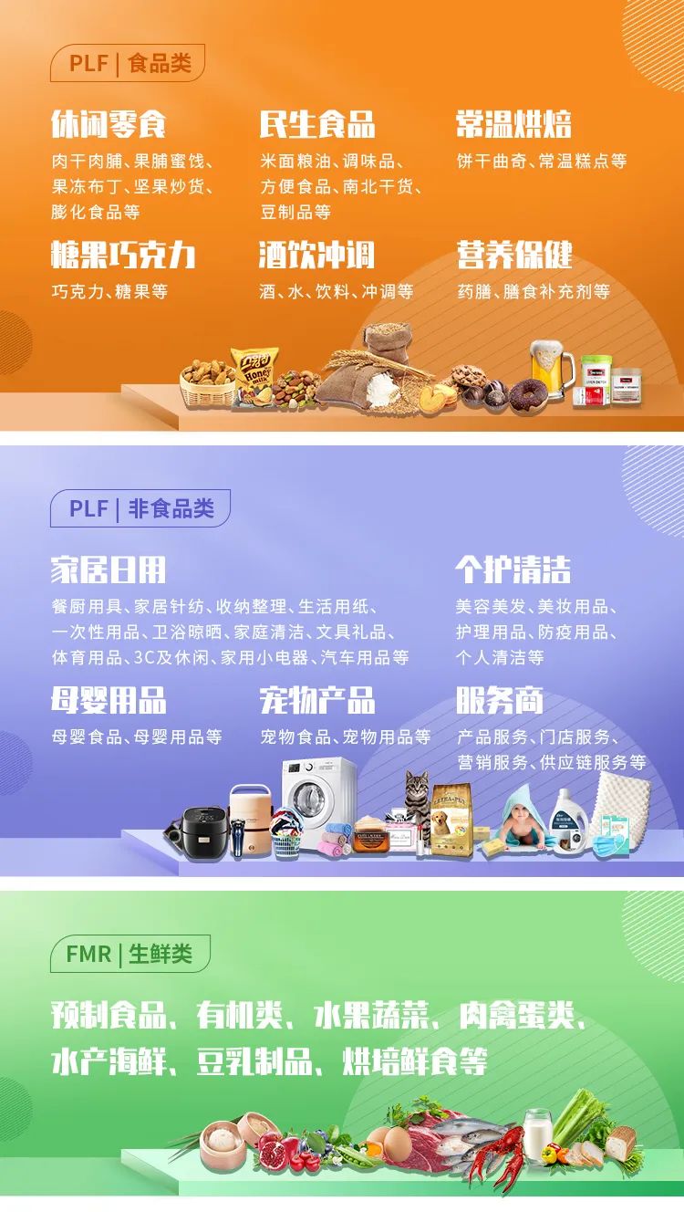 ⏩业务范围包括家居日用、美妆个护、休闲零食、粮油副食、杂粮干货、调味品(料)、烘焙糕点、糖果巧克力、酒饮冲调、生鲜食材、预制食(菜)品、宠物产品、营养保健、母婴用品等;