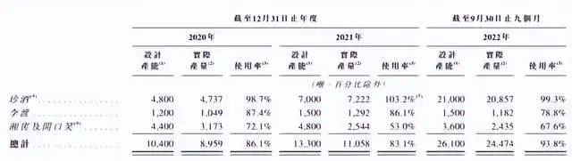虽然库存积压越来越多,但珍酒李渡仍在不断扩产。招股书显示,2020-2022年前三季度珍酒李渡整体的产能利用率达到86.1%、83.1%、93.8%,其中珍酒的产能利用率基本处在100%左右水平。
