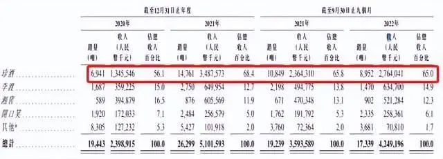 招股书显示,贵州珍酒李渡2020年、2021年及2022年前9个月的总收入分别约为23.99亿、51.02亿以及42.49亿元。