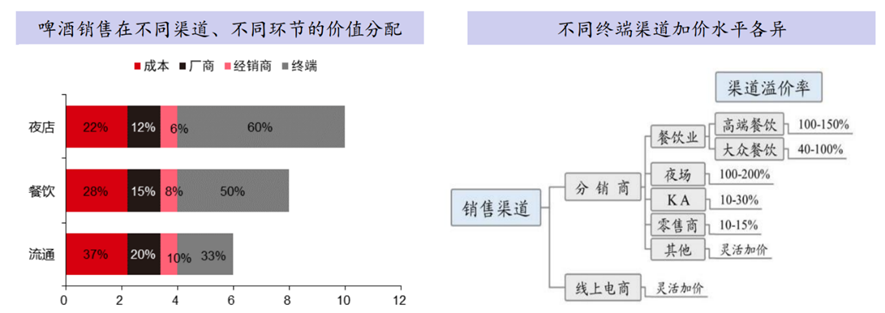 渠道上,华润积极突破高端渠道。终端渠道拿走啤酒价格中大部分溢价,高端现饮渠道加价能力尤强。在啤酒的终端零售价中,啤酒厂商获取的价格份额仅在12%-20%之间,分销商在6%-10%之间,终端渠道端价格份额在33%-60%,绝大部分利润被终端渠道所占据,经销商通过扁平化+高周转提高利润规模。百威在现饮渠道布局占比最高,尤其是夜场渠道,占到了百威20%的销量比例。 不考虑疫情冲击下,百威在餐饮和夜场渠道的销量占比分别为40%和20%,累计拥有60%的现饮市场占比;重啤累计拥有55%的现饮渠道;青啤累计55%;华润非现饮渠道占比最高,达到了57%,这也是华润本身吨收入及毛利率低的原因。