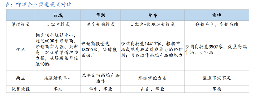 国内头部啤酒厂商各有优势区域。由于中国大部分啤酒企业都是从区域龙头发展起来的,因此即使头部企业已在全国不同区域建立起分销网络,但各家依旧拥有较为优势的区域性市场。具体来看,华润啤酒的优势区域市场包括四川、贵州、安徽和辽宁;青岛啤酒的优势区域市场包括山东、陕西等地区;百威的优势区域主要包括福建、江西;燕京主要在北京、广西和内蒙古等区域具有较强市场优势;而嘉士伯的优势市场主要集中在西北地区,包括新疆、西藏、宁夏和重庆地区;燕京在北京、广西和内蒙古。目前仍有多个区域尚未决出绝对龙头,后续在相关区域内的竞争仍有一定看点。
