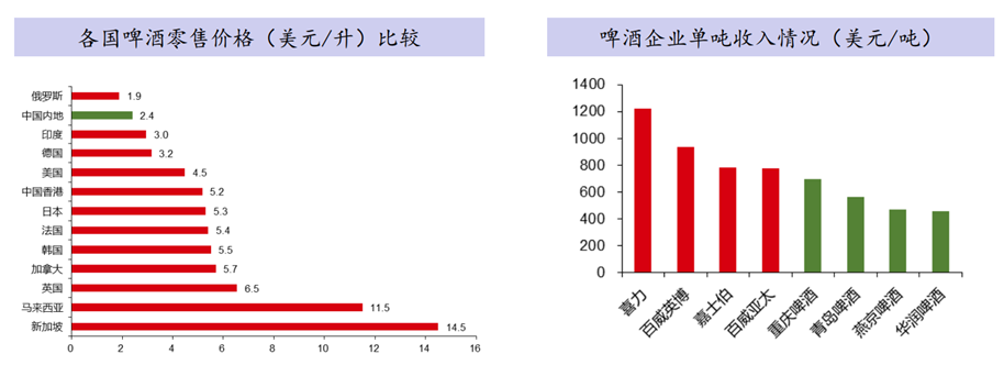 未来的成长驱动来源于吨价提升。行业产量见顶之前,为了避免丢失市场份额,酒企之间陷入了价格战,行业利润率水平低下,自2010年起,我国啤酒行业先后经历了三轮价格提升,企业也从过去考核规模转到考核利润水平,先后宣布高端化转型。目前我国啤酒高端化尚刚起步,中高端产品占比仅三成,吨价即使与香港相比也有一部差距。伴随着居民饮酒意识从“喝饱”向“喝好”转变,以及人均消费能力的提升,我们认为吨价提升将成为行业增长的新动能。
