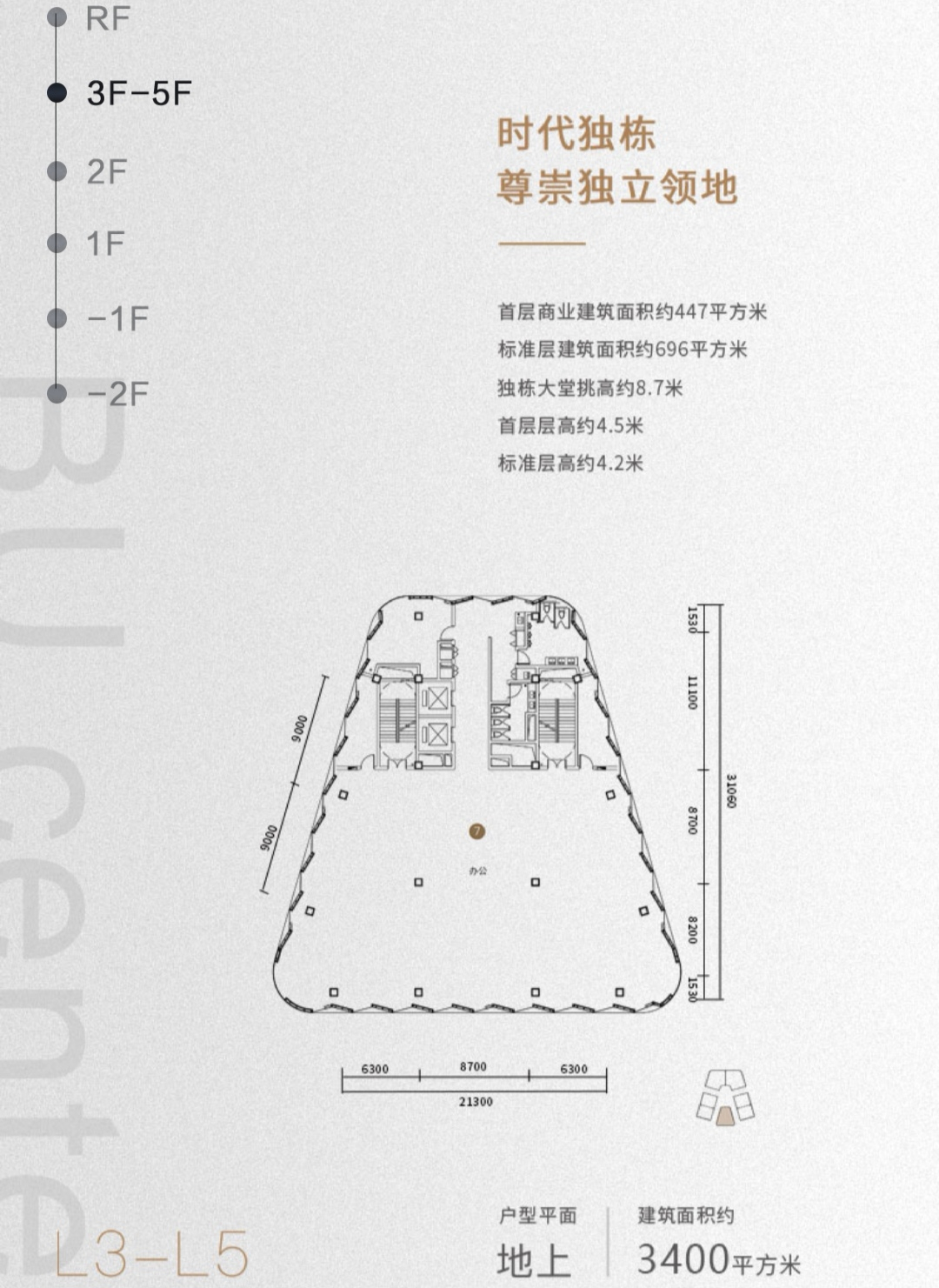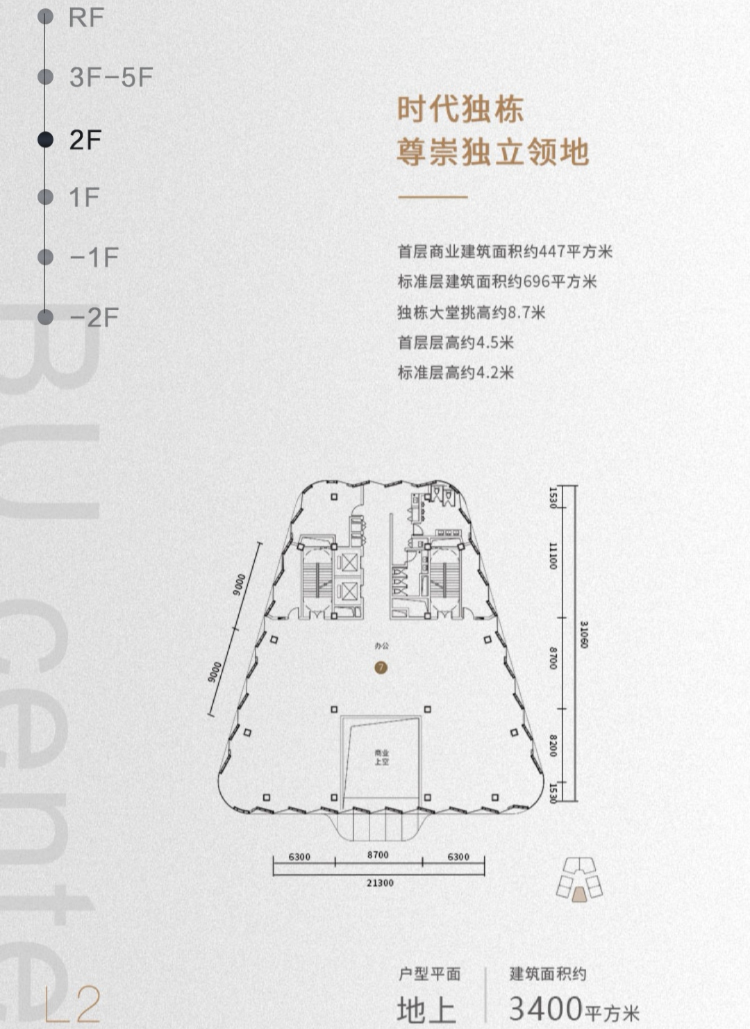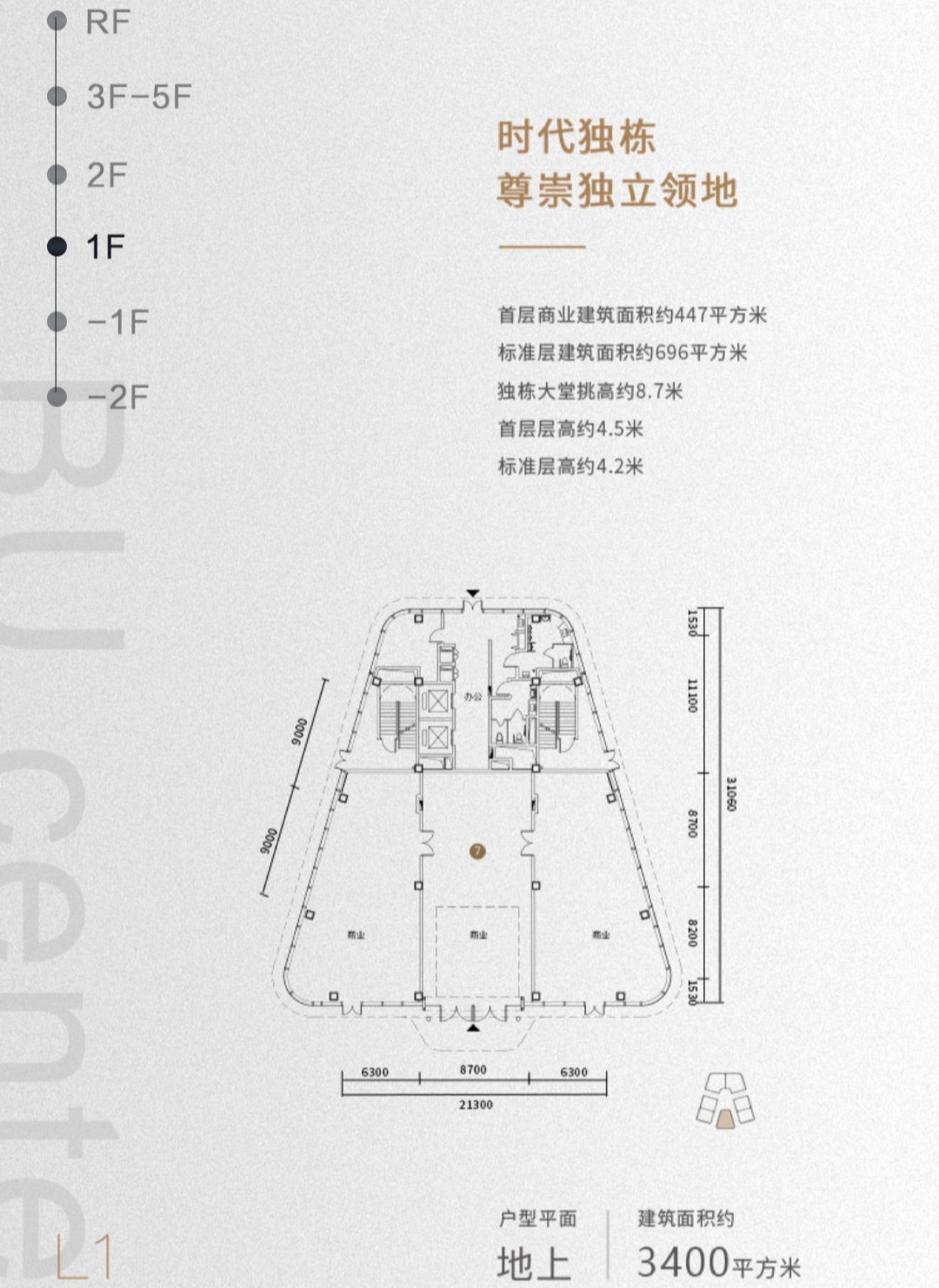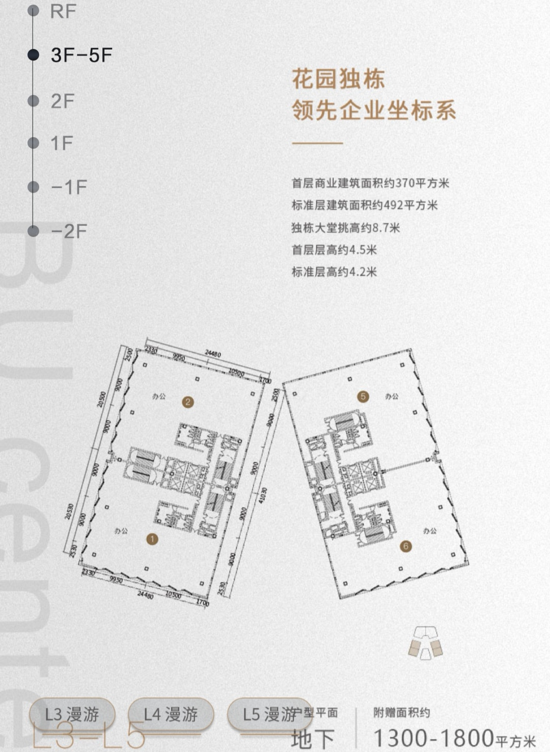 ①花园独栋:2360㎡:赠地下室1400㎡、屋顶花园200㎡、使用面积达4000㎡②时代独栋:3400㎡:赠地下室1800㎡、屋顶花园300㎡、使用面积达5500㎡③封面独栋:4100㎡:赠地下室2000㎡、屋顶花园500㎡、使用面积达6700㎡层高:大堂挑高8.7米,地上一层商业性质4.5米,二至五层4.2米甲级办公:三栋(每栋约19000m²),整层面积2200m²,总高9层;首层挑高:约8.6m,标准层高:约4.3m赠送面积:赠送企业独立冠名权、下沉式庭院、屋顶花园、地下3层,屋顶花园,B1层6.4米层高、赠送650-1050㎡(可隔2层),B2层3.8米层高、赠送面积650-1050㎡!