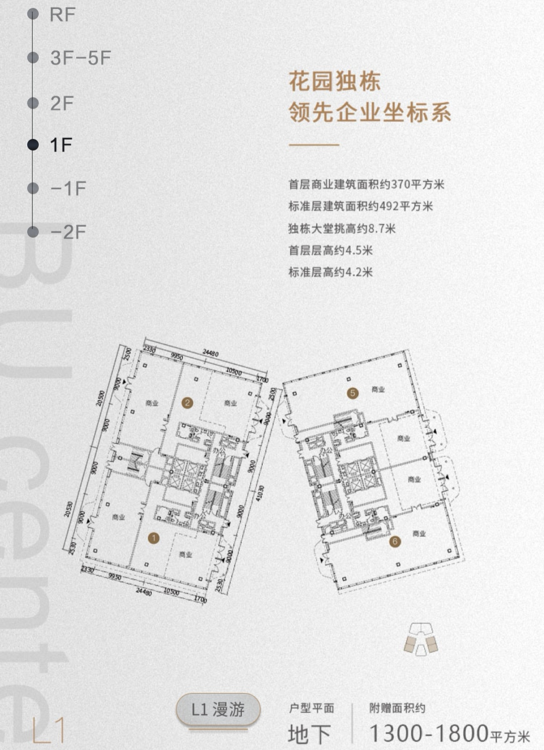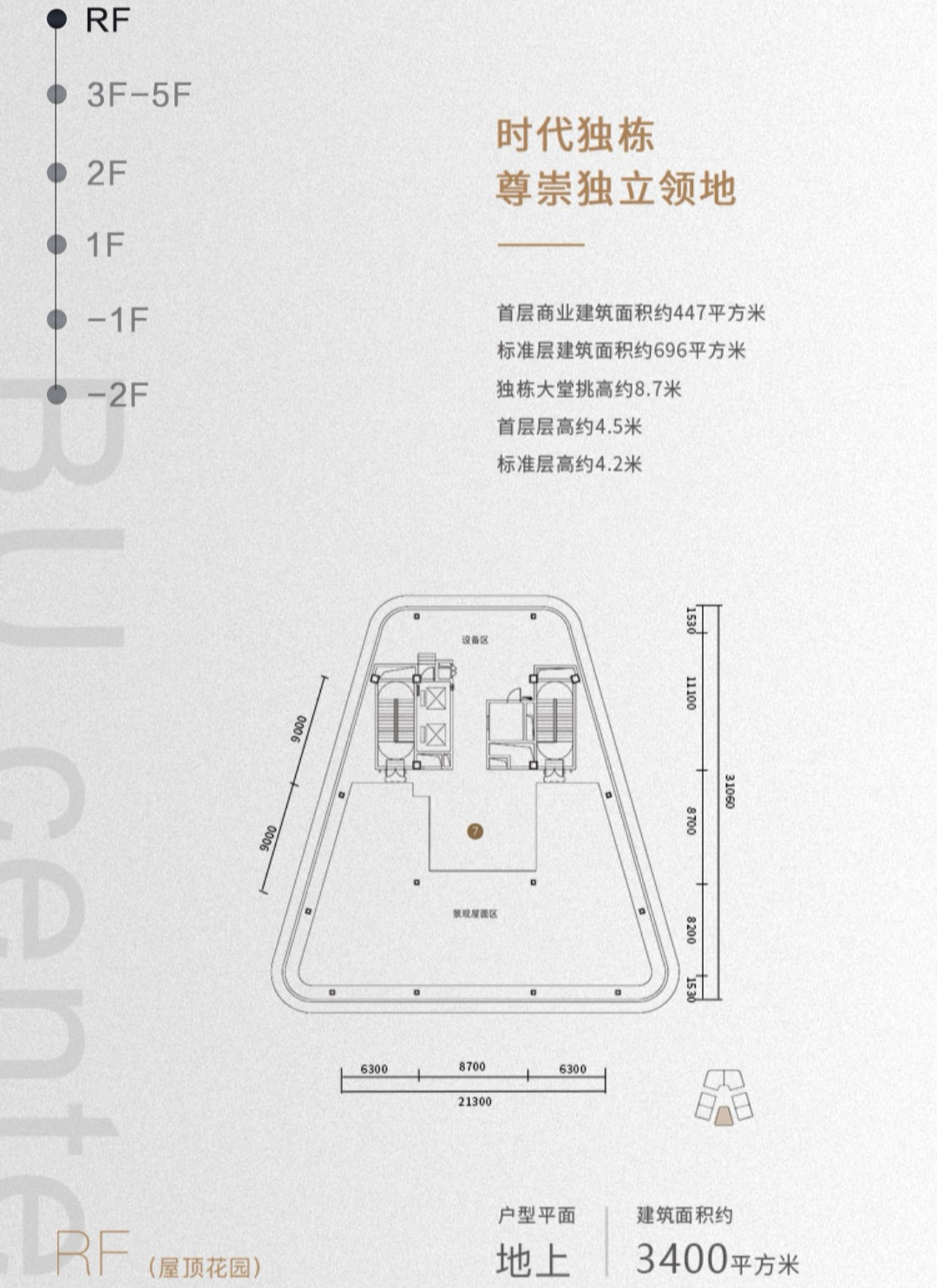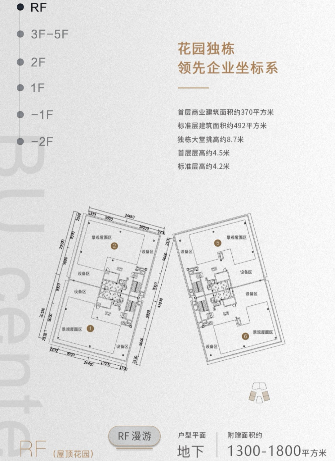 ①花园独栋:2360㎡:赠地下室1400㎡、屋顶花园200㎡、使用面积达4000㎡②时代独栋:3400㎡:赠地下室1800㎡、屋顶花园300㎡、使用面积达5500㎡③封面独栋:4100㎡:赠地下室2000㎡、屋顶花园500㎡、使用面积达6700㎡层高:大堂挑高8.7米,地上一层商业性质4.5米,二至五层4.2米甲级办公:三栋(每栋约19000m²),整层面积2200m²,总高9层;首层挑高:约8.6m,标准层高:约4.3m赠送面积:赠送企业独立冠名权、下沉式庭院、屋顶花园、地下3层,屋顶花园,B1层6.4米层高、赠送650-1050㎡(可隔2层),B2层3.8米层高、赠送面积650-1050㎡!
