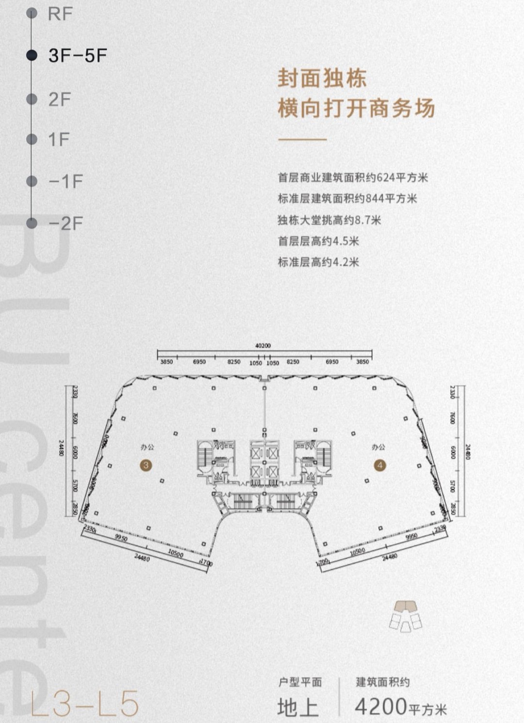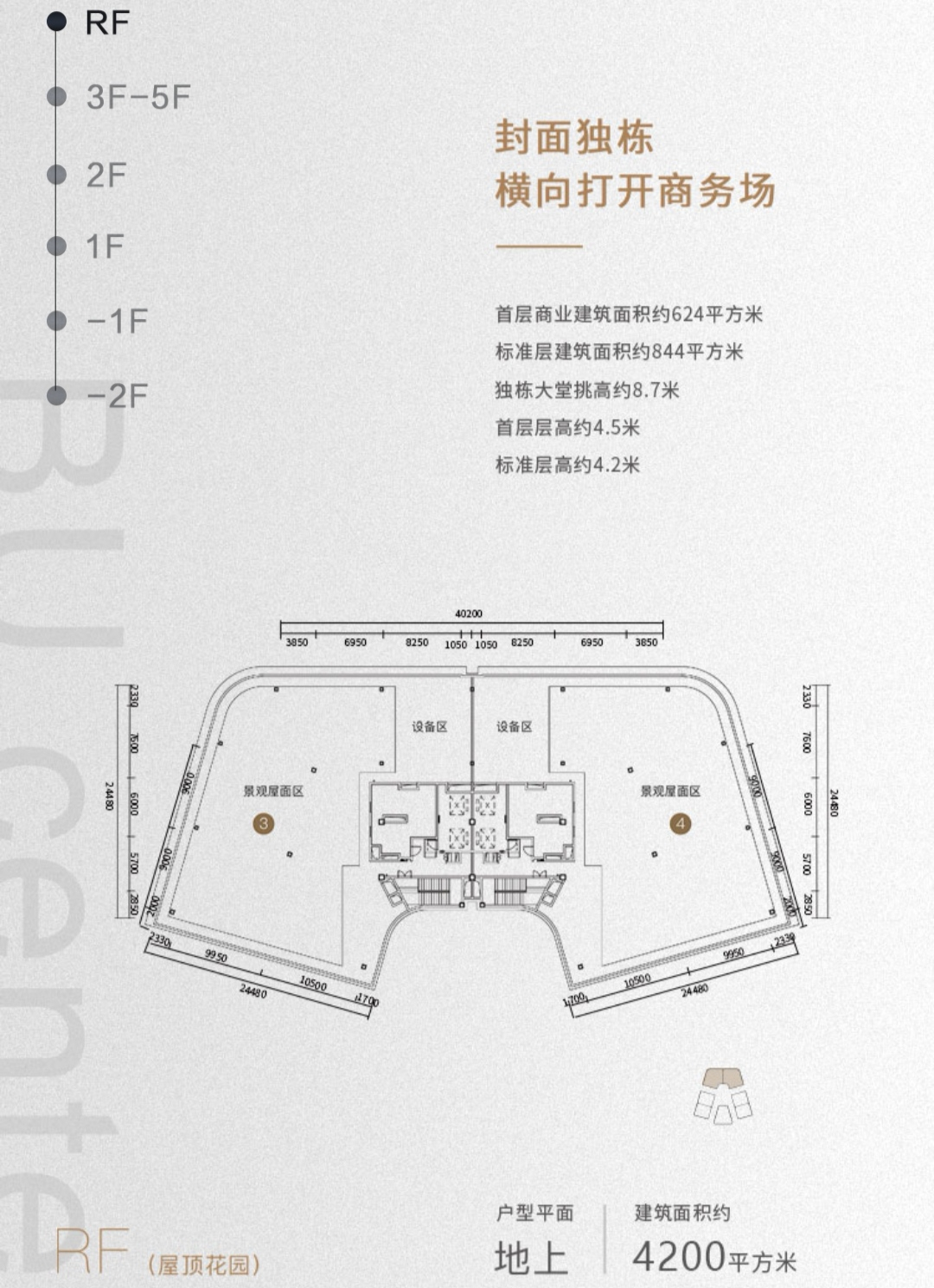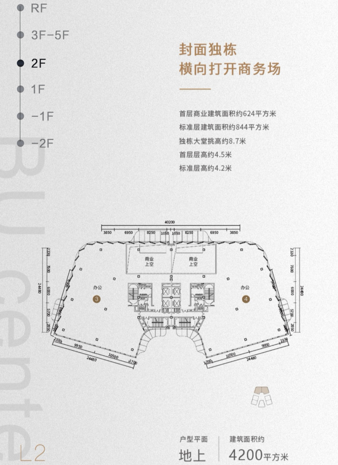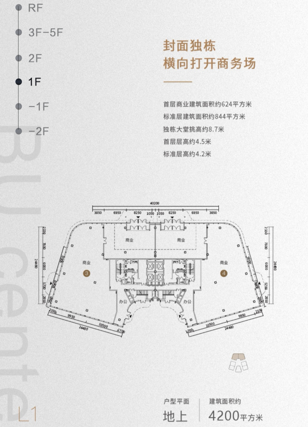 ①花园独栋:2360㎡:赠地下室1400㎡、屋顶花园200㎡、使用面积达4000㎡②时代独栋:3400㎡:赠地下室1800㎡、屋顶花园300㎡、使用面积达5500㎡③封面独栋:4100㎡:赠地下室2000㎡、屋顶花园500㎡、使用面积达6700㎡层高:大堂挑高8.7米,地上一层商业性质4.5米,二至五层4.2米甲级办公:三栋(每栋约19000m²),整层面积2200m²,总高9层;首层挑高:约8.6m,标准层高:约4.3m赠送面积:赠送企业独立冠名权、下沉式庭院、屋顶花园、地下3层,屋顶花园,B1层6.4米层高、赠送650-1050㎡(可隔2层),B2层3.8米层高、赠送面积650-1050㎡!