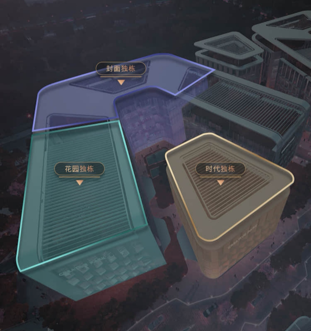 单栋地上建筑面积约2400㎡-4100㎡,专属打造时代独栋、封面独栋、花园独栋三大产品。