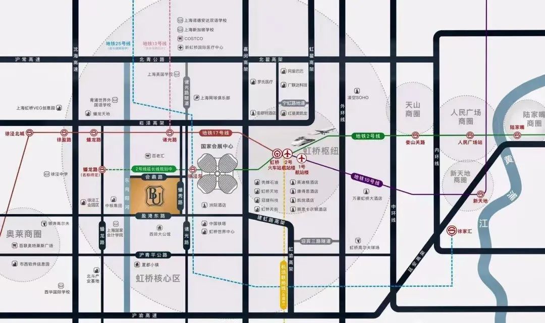 项目周边周边拥有地铁2号、10号、17号线三条轨交,距离地铁口300米(2号线徐泾东8号口),距离虹桥枢纽地面2.5公里无红绿灯,地下空间与虹桥枢纽互通可步行直达。「虹桥BU中心」