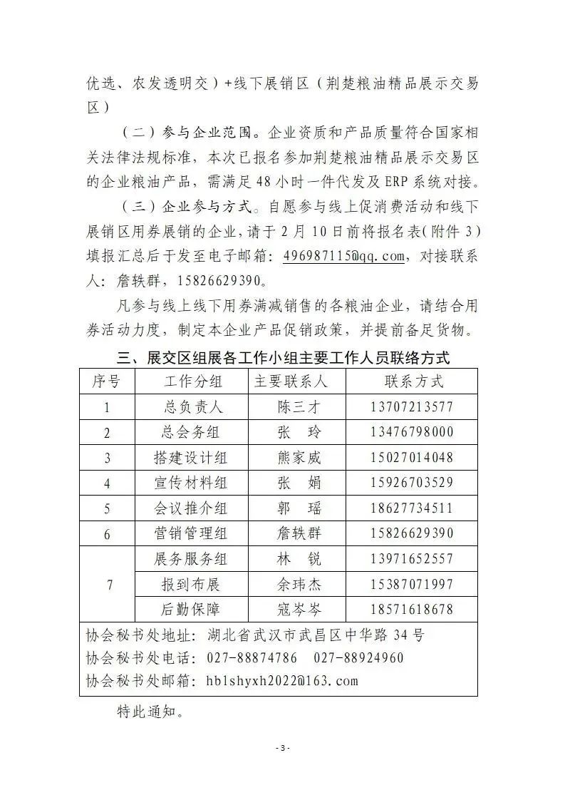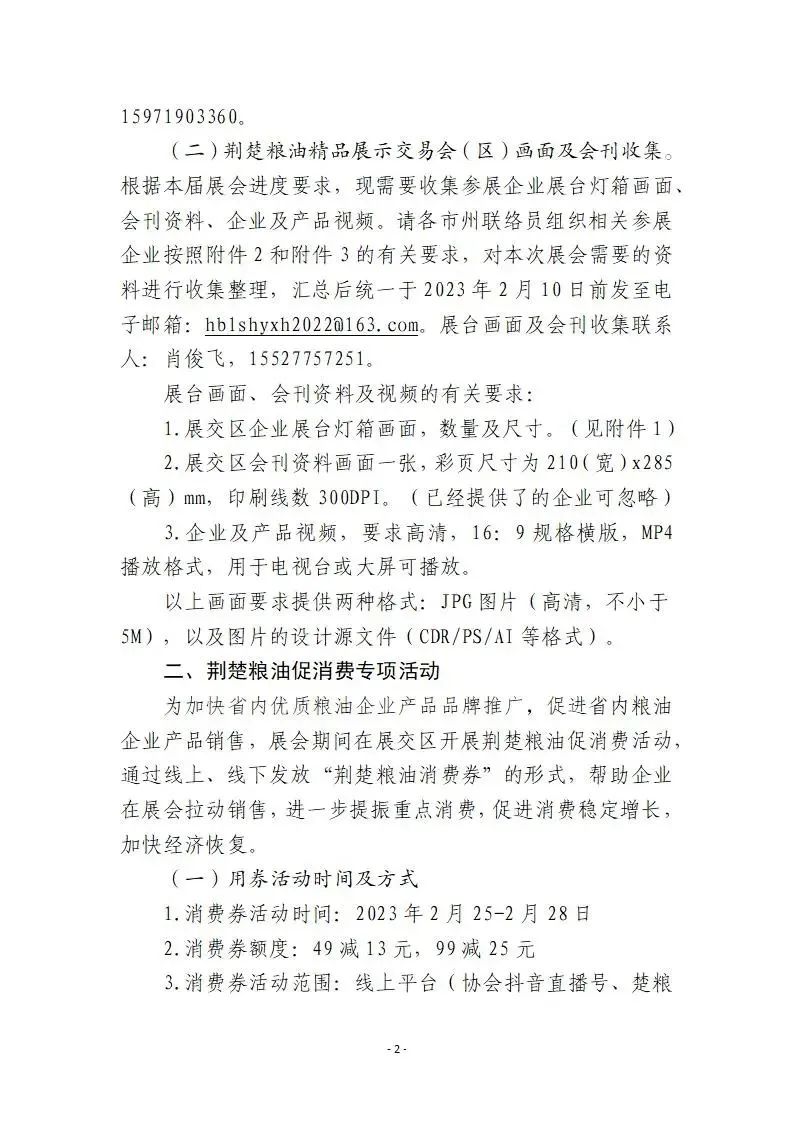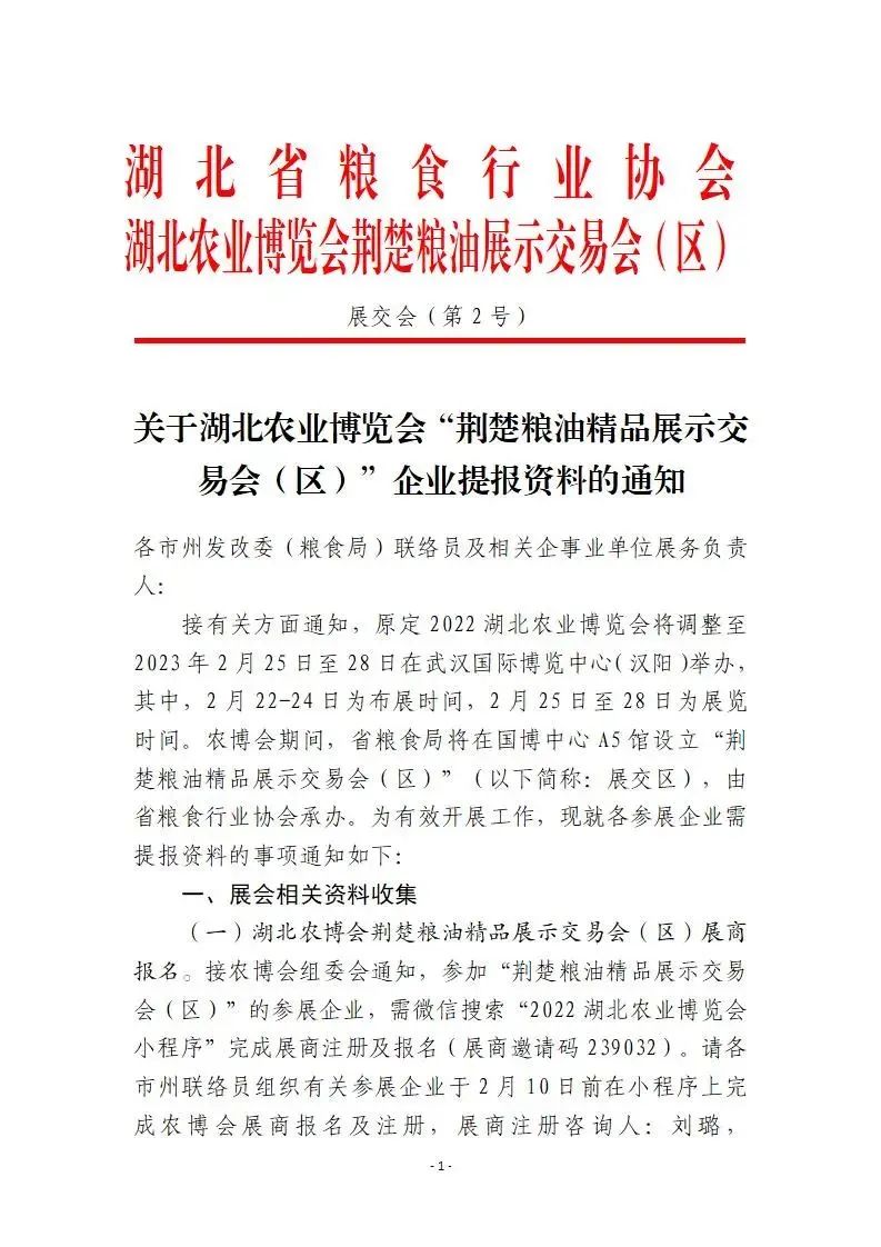 接有关方面通知,原定2022湖北农业博览会将调整至2023年2月25日至28日在武汉国际博览中心(汉阳)举办,其中,2月22-24日为布展时间,2月25日至28日为展览时间。农博会期间,省粮食局将在国博中心A5馆设立“荆楚粮油精品展示交易会(区)”(以下简称:展交区),由省粮食行业协会承办。为有效开展工作,现就各参展企业需提报资料的事项通知如下:(一)湖北农博会荆楚粮油精品展示交易会(区)展商报名。接农博会组委会通知,参加“荆楚粮油精品展示交易会(区)”的参展企业,需微信搜索“2022湖北农业博览会小程序”完成展商注册及报名(展商邀请码239032)。请各市州联络员组织有关参展企业于2月10日前在小程序上完成农博会展商报名及注册,展商注册咨询人:刘璐,15971903360。(二)荆楚粮油精品展示交易会(区)画面及会刊收集。根据本届展会进度要求,现需要收集参展企业展台灯箱画面、会刊资料、企业及产品视频。请各市州联络员组织相关参展企业按照附件2和附件3的有关要求,对本次展会需要的资料进行收集整理,汇总后统一于2023年2月10日前发至电子邮箱:hblshyxh2022@163.com。展台画面及会刊收集联系人:肖俊飞,15527757251。1.展交区企业展台灯箱画面,数量及尺寸。(见附件1)2.展交区会刊资料画面一张,彩页尺寸为210(宽)x285(高)mm,印刷线数300DPI。(已经提供了的企业可忽略)3.企业及产品视频,要求高清,16:9规格横版,MP4播放格式,用于电视台或大屏可播放。以上画面要求提供两种格式:JPG图片(高清,不小于5M),以及图片的设计源文件(CDR/PS/AI等格式)。为加快省内优质粮油企业产品品牌推广,促进省内粮油企业产品销售,展会期间在展交区开展荆楚粮油促消费活动,通过线上、线下发放“荆楚粮油消费券”的形式,帮助企业在展会拉动销售,进一步提振重点消费,促进消费稳定增长,加快经济恢复。1.消费券活动时间:2023年2月25-2月28日3.消费券活动范围:线上平台(协会抖音直播号、楚粮优选、农发透明交)+线下展销区(荆楚粮油精品展示交易区)(二)参与企业范围。企业资质和产品质量符合国家相关法律法规标准,本次已报名参加荆楚粮油精品展示交易区的企业粮油产品,需满足48小时一件代发及ERP系统对接。(三)企业参与方式。自愿参与线上促消费活动和线下展销区用券展销的企业,请于2月10日前将报名表(附件3)填报汇总后于发至电子邮箱:496987115@qq.com,对接联系人:詹轶群,15826629390。凡参与线上线下用券满减销售的各粮油企业,请结合用券活动力度,制定本企业产品促销政策,并提前备足货物。办公室:027-88874786