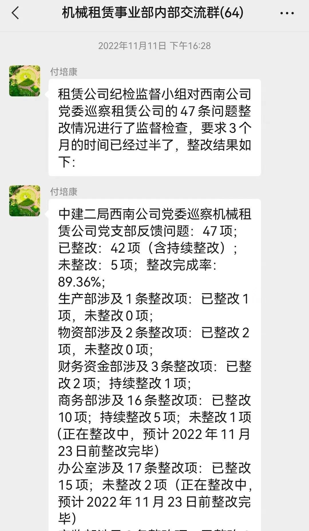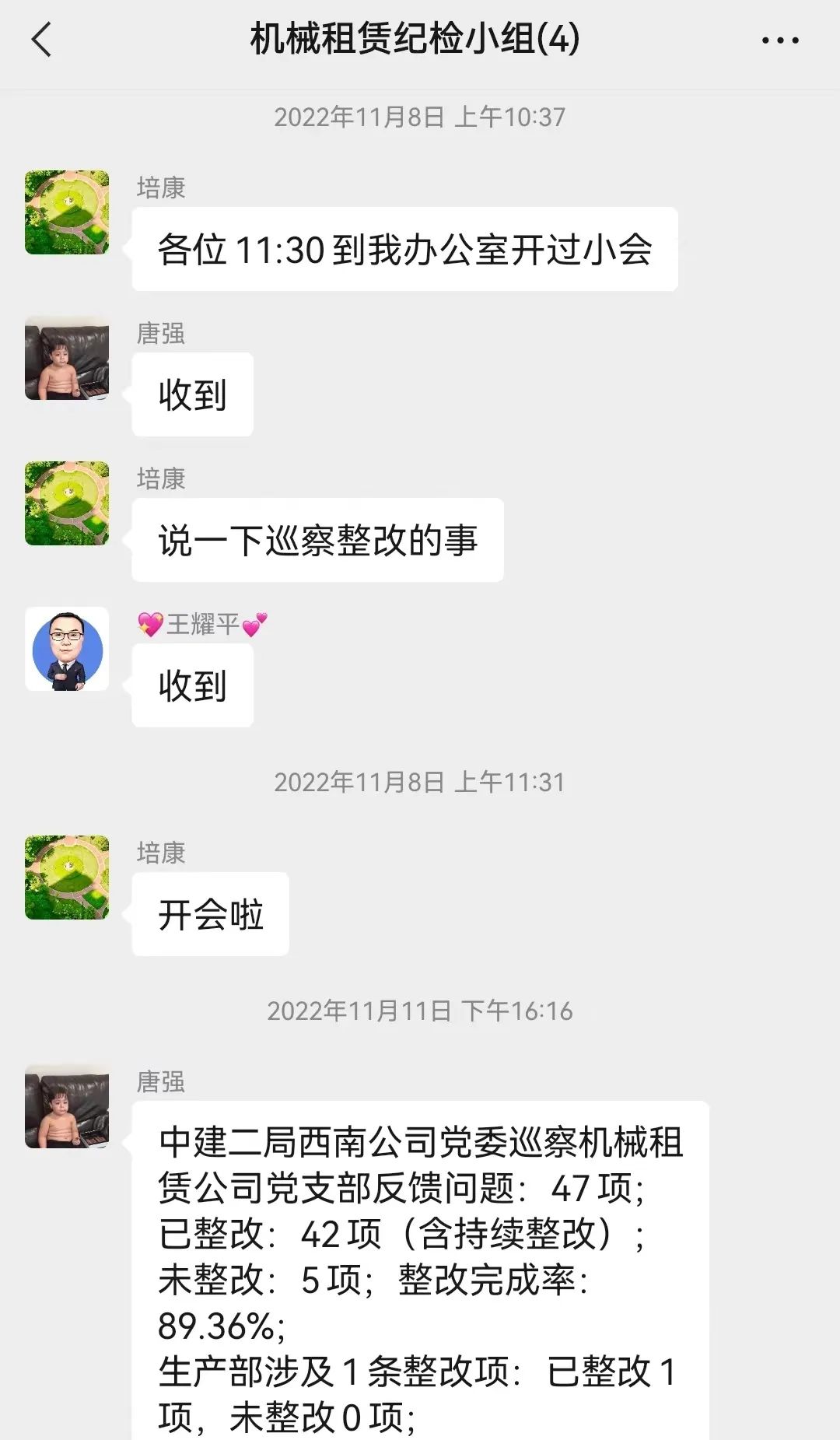 自巡察反馈以来,机械租赁公司党支部组织召开巡察整改推进会2次,纪检监督小组开展监督检查3次,按计划在微信群汇报整改完成情况。