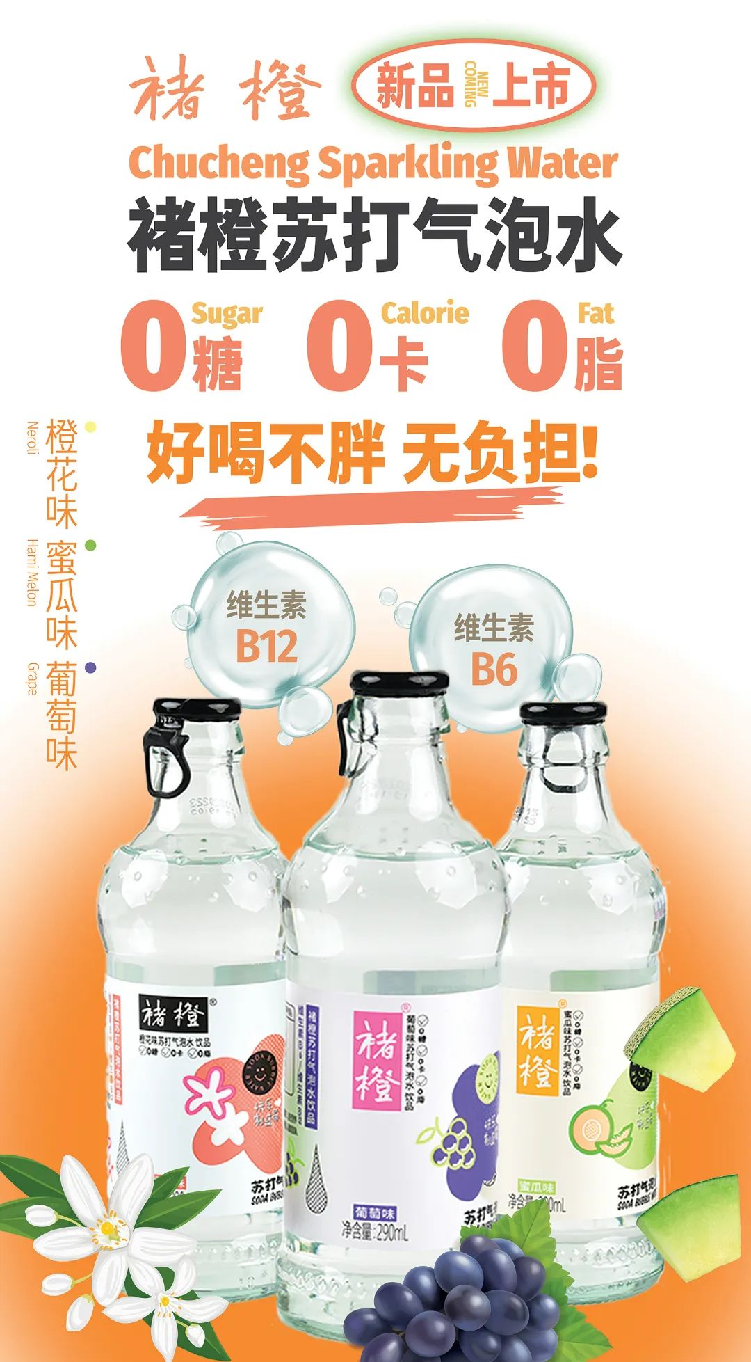褚橙结合趋势,推出褚橙无糖气泡水,3.5倍气含量,口感上气泡迭起,使得舌尖上触感良好平衡,冰爽愉悦,增加了维生素B6,B12,以及膳食纤维,轻负担,符合健康饮食的主流意识。