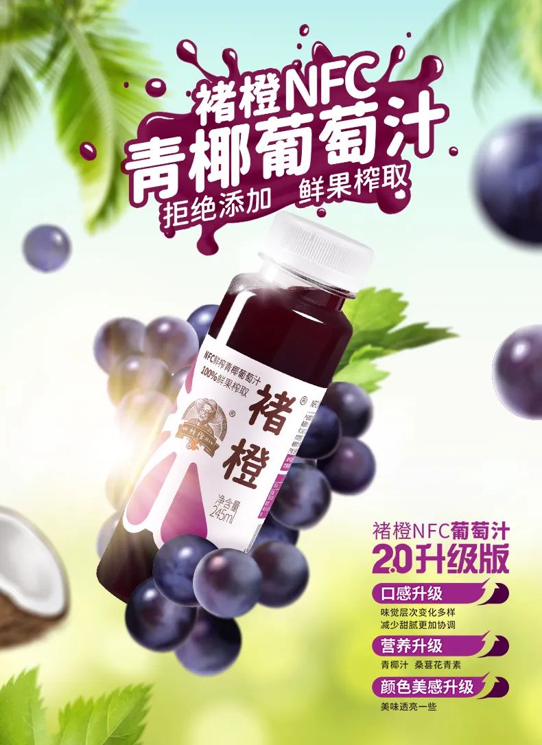 褚橙NFC青椰葡萄汁,采用云南高原上建水自然成熟的夏黑葡萄为主料,沿用褚橙NFC橙汁高标准工艺,配合先进的进口榨汁设备,全程冷压榨,在整个加工过程中,不添加任何添加剂,甚至不加一滴水,将夏黑葡萄的香甜韵味,青椰汁的清爽,桑葚的浓郁,融合到一起,浑然天成。