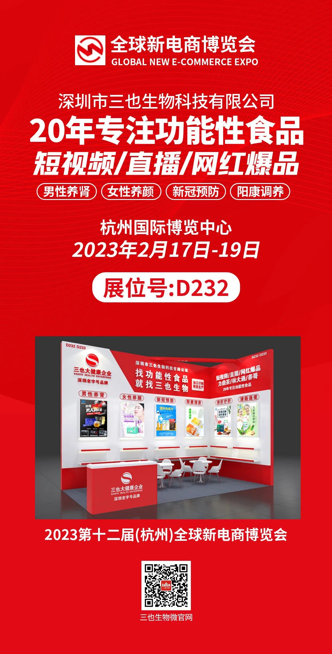 “2023第十二届(杭州)全球新电商博览会”将于2023年2月17日-2月19日在杭州国际博览中心隆重举行。三也大健康企业将派团队参加此次展会,欢迎新老朋友过来展会参观咨询。