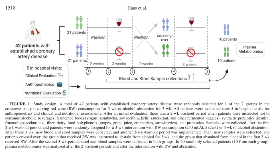 本文是由Elisa A Haas,Mario JA Saad,Andrey Santos等人联合发表在《Clinical Nutrition》上的一项研究,旨在研究服用红酒对冠状动脉粥样硬化性心脏病患者肠道微生物组成、血浆TMAO和血浆代谢组的影响。