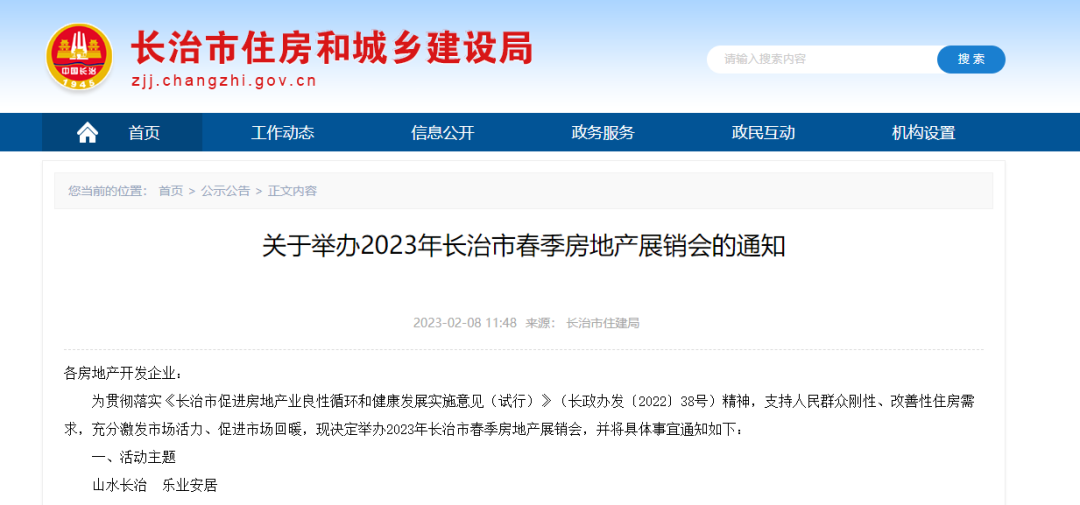 为贯彻落实《长治市促进房地产业良性循环和健康发展实施意见(试行)》(长政办发〔2022〕38号)精神,支持人民群众刚性、改善性住房需求,充分激发市场活力、促进市场回暖,现决定举办2023年长治市春季房地产展销会,并将具体事宜通知如下: