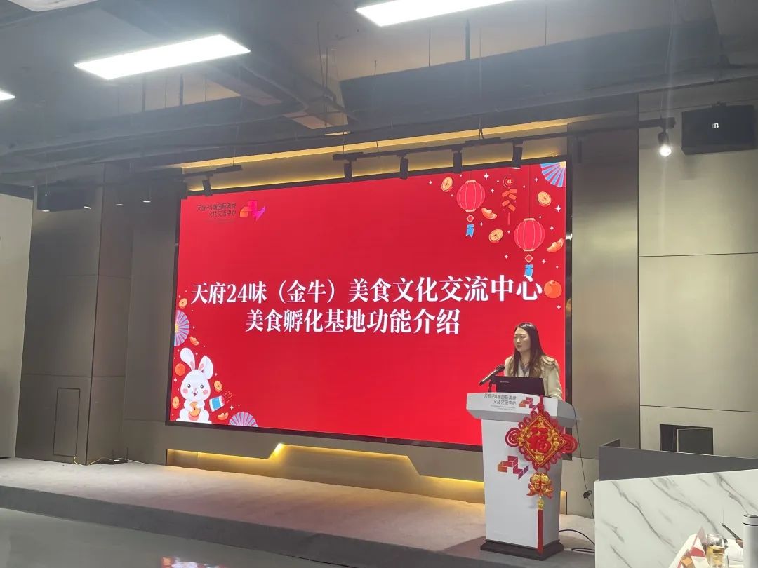 随后,天府24味(金牛)美食文化交流中心基地运营负责人王安祺详细地为大家介绍了美食孵化基地功能,打造涵盖美食直播、品牌孵化、预制菜展销、新品发布及会议、菜品研发、大师课堂、青少年食育教育、党群服务、宵夜啤酒、专业比赛、节庆活动等多元化的文化体验和餐饮消费新场景。