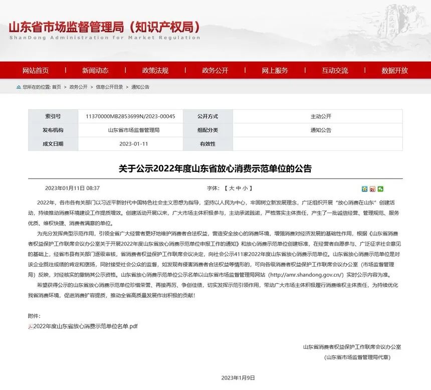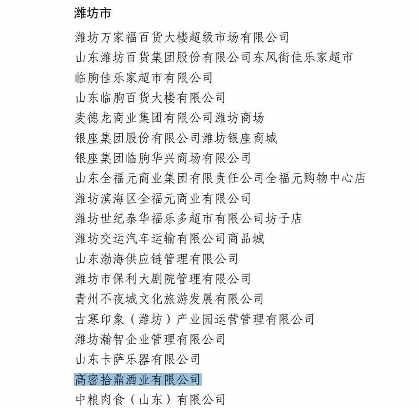 高密拾鼎酒业有限公司入选“山东省放心消费示范单位”