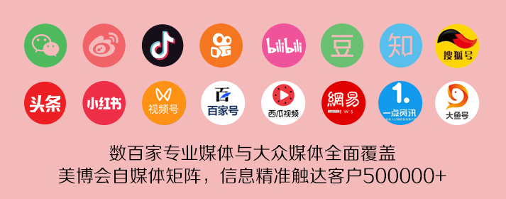 展会借助专业线、日化线、供应线以及大众时尚类媒体的覆盖面和影响力,将美博会及展商的信息传递给受众群体。展览现场媒体中心设置国际和国内、专业和大众媒体进行采访邀约。美博会拥有公众号、抖音号、视频号、小红书、微博等自媒体矩阵,信息精准触达客户500000+,每日传递最新展览资讯、提供在线展览服务。