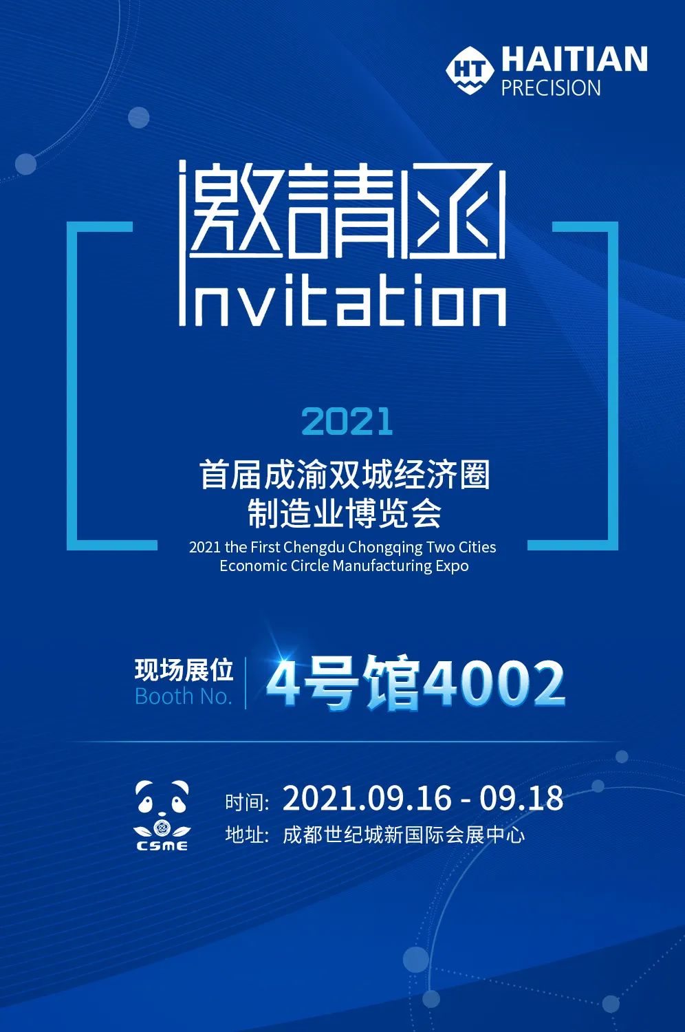 9月16—18日,2021首届成渝双城经济圈制造业博览会将在成都世纪城新国际会展中心举办。此次展会集高层论坛、产品展览、科技交流、经贸洽谈、产业链招商、供应链协同配套为一体,推进成渝地区一体化发展。海天精工展位号:4号馆4002,期待您莅临参观!