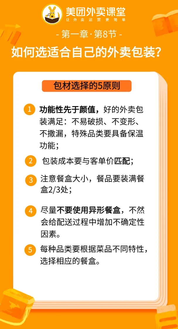 在这个重颜值的时代,消费者对于外卖包装的诉求在逐渐提高,在餐品质量差异不大的前提下,那些包装好的商品,更具市场竞争力,能加深消费者印象,激发顾客再次购买的欲望。但对于外卖包装的作用,大家应该有正确的认识:过分关注包装颜值忽略成本,或过分关注成本忽略用户体验都是不可取的。外卖包装怎么选,选择外卖包装要注意什么?今天,就来给大家讲讲:外卖包装的选择。1、好的包装应满足这几点:不易破损、不变形、不撒漏,特殊品类要具备保温功能。顾客点外卖最基本的要求是:到手的食物能保持完整,如果这点都做不到,那颜值再高也没用。2、在满足以上基础需求后,就可以根据预算考虑颜值做用户体验了。包装的成本要跟客单价匹配,如果是高客单外卖,就一定不能在包装上省钱;如果商家走极致性价比的路线,客单价25元以内,两菜一主食搭配的快餐,包装应走简洁、实用路线,切忌画蛇添足配套过多的纸盒、腰封等装饰大于功用的东西。3、注意餐盒大小,菜品要装满餐盒2/3以上,太多容易洒漏,并且显得不够精致;太少显得量不足,2/3份量视觉上刚刚好。4、尽量不要使用异形餐盒,异形餐盒颜值虽高,但较占摆放位置,配送过程中易变形;对于没有自家配送团队的餐厅来说,使用圆盒、方盒最为实用保险。