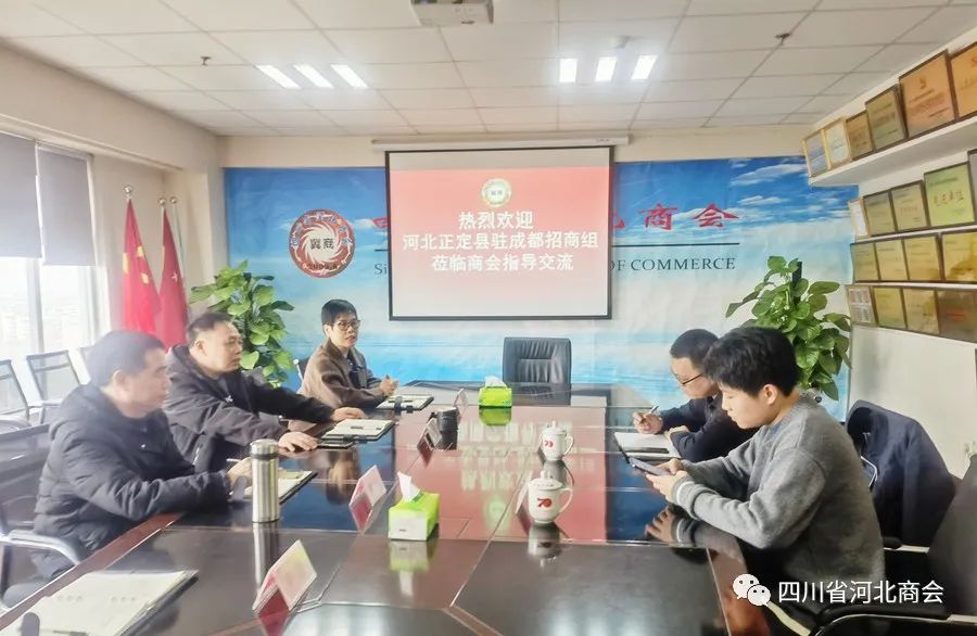 2023年2月6日下午,河北省正定县驻成都招商组副组长刘冲、组员张宙隆到访四川省河北商会。商会秘书长翟风竹对刘组长二人到来商会表示热烈欢迎!秘书处其他工作人员参加了座谈。交流中,刘冲组长传达了正定县委、县政府招商引资决策部署,介绍了正定县“数字经济、生物医药、国际物流、装备制造”等重点招商产业,希望能在商会的引荐下,联络企业家到正定县投资发展。翟风竹秘书长介绍了商会建设情况和会员企业生产经营状况,分享了目前几家河北驻川招商组好的做法和取得的成果,并提出一些工作建议。表示,作为商会平台,服务就是我们的责任,希望今后加强联系沟通,进一步拓宽人脉和招商资源,为企业与家乡政府招商引资牵线搭桥。