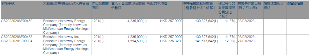 2月9日,港交所披露易显示,伯克希尔哈撒韦公司于2月3日出售了423.5万股比亚迪H股股票,平均价格257.9港元/股,持股比例降至11.87%。