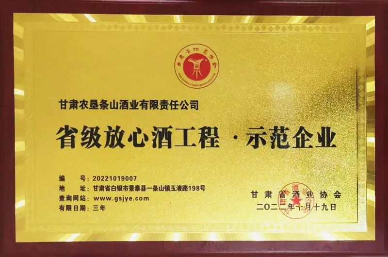 近日,甘肃农垦条山酒业公司被甘肃省酒业协会评为“省级放心酒工程·示范企业”称号。