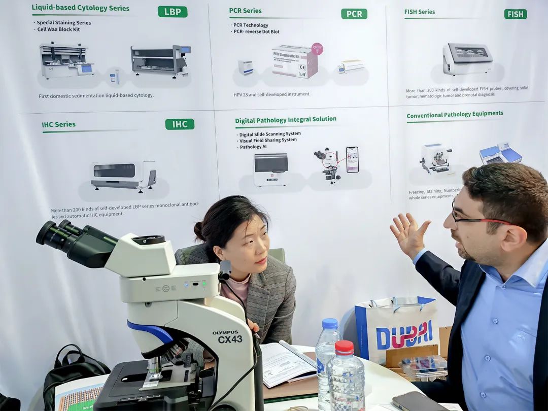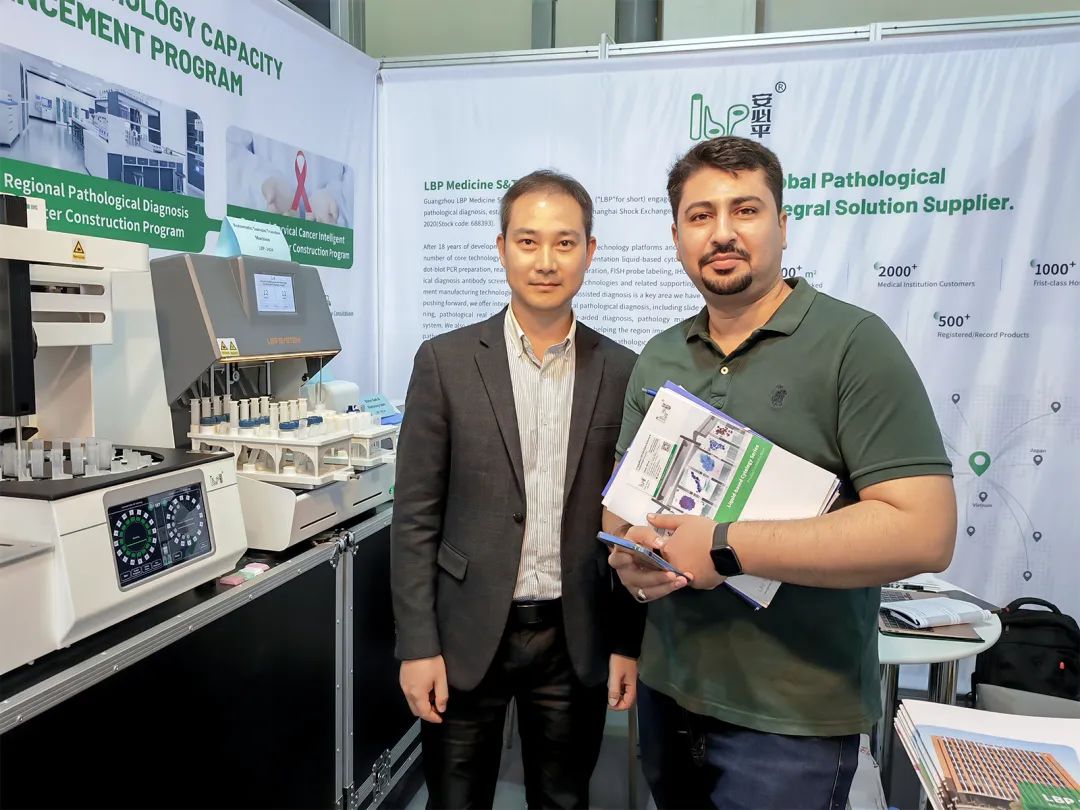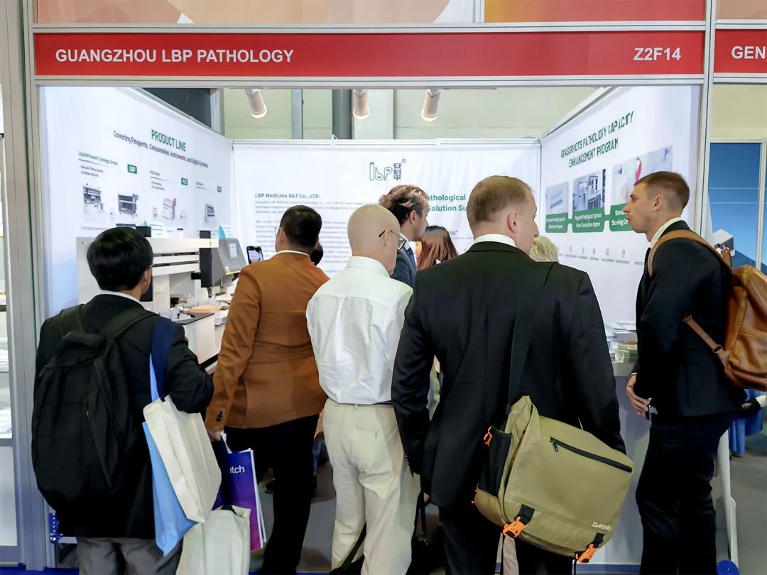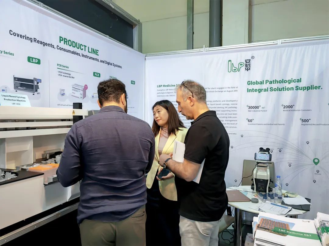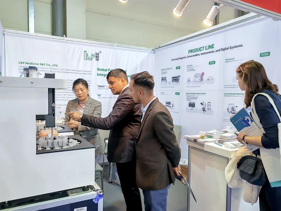 安必平专注肿瘤筛查与精准诊断,自主研发了一系列试剂与配套设备,为病理科提供“自动化、标准化、数字化、智能化”的整体解决方案。在本次展会上,LBP-4032制片染色一体机、LBP-2024自动样本转移机、LBP-TKP-H摊烤片机、LBP-SL885轮转式切片机、实视等系列产品精彩亮相,受到了众多海外客商的高度关注。