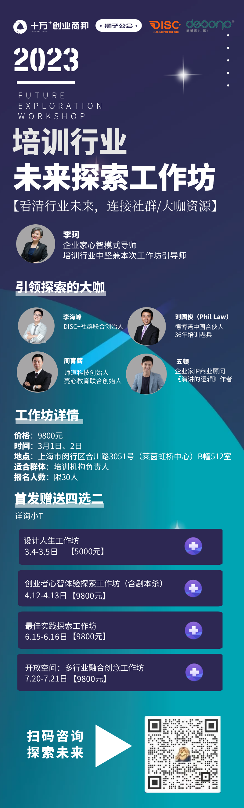 你可以看到他们认定了只要这样勤奋,就能够活下去、也能够成功。但是他们过去的这些信念对他们来说开始渐渐地不起作用了,因此他们感觉到很茫然,很纠结,甚至是痛苦。因为无论怎么勤奋都挣不到钱了,而且甚至有可能连行业都会消失不见。大马的一位企业家说:“我的行业可能马上消失了。”他一方面说政府管制,这个行业没法做了、要破产做不下去,一方面他又坚持要努力,要勤奋,要动脑筋去做,坚决不愿意转行。因为不知道未来是什么样儿,这就是人们所说的局限性信念。当我们不愿意去看未来,就一定会面临一个根本没有应对的、动荡的未来,可很多人根本不愿意看见,总是欺骗自己,明朝有一位学者说,人的一辈子就是在“自欺、欺人,被人欺”,很多人就是这个状态。未来五年,如果上帝让行业中的10家有5家能够活下来(很多人告诉我说“老师,能活一家就不错了”)有人就天真地认为这就应该是我活了,因为我是那么聪明,那么努力,我是那么的独特,我是那么的勤奋……那为什么是你啊,这不科学啊,不合逻辑啊,因为大家都很聪明都很努力很刻苦,那为什么就一定是你呢,没有办法说服自己、说服他人。你问问自己:假设我对未来的趋势都不知道,我如何能回答这三个问题? 我现在越来越深切的领会到:所有的企业家、所有优秀的企业管理者都是在为未来工作。为了公司的未来,为了团队的未来,以及为了我们自己的未来。你我都知道,将普通手机的通话质量和性能提升再好,也避免不了被智能手机取代。智能手机至少已经干掉了50多种以上产品甚至行业。相机、MP3、记事本、电子书、计算器、手表、相片、银行卡、手表、录音机、报纸杂志、电视、订票点、百货……不看未来,只看现在甚至过去我有什么问题、要怎么努力提升,没有一点用。未来探索工作坊就是这样让我们看未来的工具,他让我们整个同行一群人、用一种引导的方式共创,用流程来保证大家抛开防卫心,看到大的画面、未来的画面,共同设定通向未来的目标并落实计划。这是我一直非常喜欢的一个工作方法,我在零九年就已经在自己的企业和其他行业到处去应用。例如通信行业、农产品行业、金融行业……都取得了很好的效果,那些在09年探索到的趋势,到今天都发生了。例如我们曾经在十年前预见培训行业里测评、软技能、引导技术、娱乐化、混合式学习……预见信用卡的停滞甚至萎缩、预见金融信息的全面透明与整合、预见农产品的网络平台整合……整个工作坊的感受就是一步步带你展开过去、现在、未来的历史画卷,让你成为“穿越者”,拿到未来的“身心脑”的体验,再回到今天做规划,所谓站在后天看明天,做今天的规划。其实啊,人们已在许多文化和地区的社会里运用过未来探索工作坊。比如,北美因纽特人的经济发展会议、明尼苏达州拉姆齐城镇的福利改革、英国的可持续生物群落、巴西更有效的商业计划、瑞典的媒体协作、全美国的教育改革等,目前未来探索网络的数据库里有世界上的近千个案例。自 1991 年以来,来自亚洲、澳洲、加拿大、加勒比海地区、欧洲、印度、南非、南美和美国的上万人参加过未来探索会议,几百人继续激励社会、技术和经济的全球积极协作。未来探索学习工作坊给予你成功组织未来探索会议所需的工具、洞见和支持。当我把要做培训行业未来探索工作坊的想法告诉培训界几位大咖时,他们立刻兴致盎然地说要参加,而且为我出谋划策、一起想怎么为我们自己的行业做好这次探索。这些大咖包括中国培训业界最牛的社群创始人李海峰老师,36年培训老兵,德博诺中国负责人刘国俊老师,中莹空中学堂及老板私塾亮心教育的合伙人周育薪老师,百万女性新商成长客户群社群合伙人五顿老师等。你如果来的话,将与这些大咖们一起发起讨论、一起创造未来,同时,我也希望,这是一次各种资源链接的活动。 所以,如果你是培训机构的负责人,我强烈推荐你来参加培训行业的未来探索工作坊。