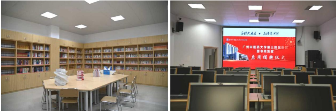 图书阅览室环境整洁、安静、舒适,非常适合阅读;阅览室现有书籍3000册,电教室台式电脑60台,全区域无线Wi-Fi覆盖,也可自行携带笔记本电脑进行文献查询;电教室还配有LED屏、音响系统等,可进行小型的学术研讨活动。师生员工可在图书阅览室登录广州中医药大学图书馆文献资源库进行文献查阅。