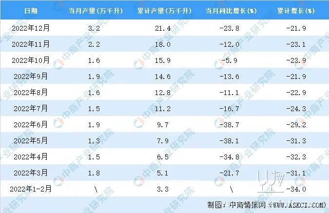 据中商产业研究院数据库显示,2022年12月全国葡萄酒当月产量与去年同期相比下降。2022年12月全国葡萄酒产量为3.2万千升,同比下降23.8%。2022年1-12月全国葡萄酒产量21.4万千升,同比下降21.9%。