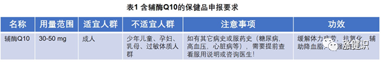 现在辅酶Q10已收录于《中华人民共和国药典》中,在我国已经批准的辅酶Q10保健食品中,每日用量范围为10-50 mg,每日的推荐摄入量为30-50 mg。根据《关于含辅酶Q10保健食品产品注册申报与审评有关规定的通知》,辅酶Q10允许申报的保健功能为“缓解体力疲劳,抗氧化,辅助降血脂,增强免疫力”不适宜人群项应包括“少年儿童、孕妇、乳母、过敏体质人群”(参考表1)。