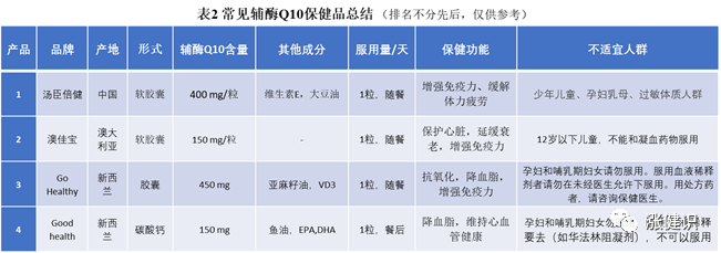 目前市场上以辅酶Q10为主要成分的保健食品产品主要有片剂、胶囊、软胶囊剂型等,其每片中辅酶Q10的含量在5~400 mg不等,存在形式包括单一辅酶Q10,添加维生素E,添加鱼油,添加有机亚麻籽油,添加维生素D等。其它成分的添加可以帮助促进辅酶Q10的吸收,或者与辅酶Q10协同作用(促进其抗氧化等作用的发挥)。表2中列出了部分常见的辅酶Q10产品信息,排名不分先后,仅供参考。为提高辅酶Q10的吸收和功能性的发挥,多建议随餐服用。