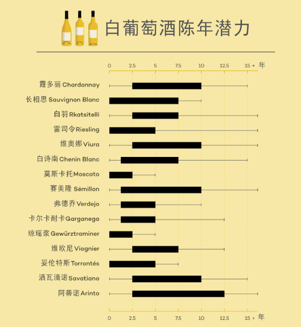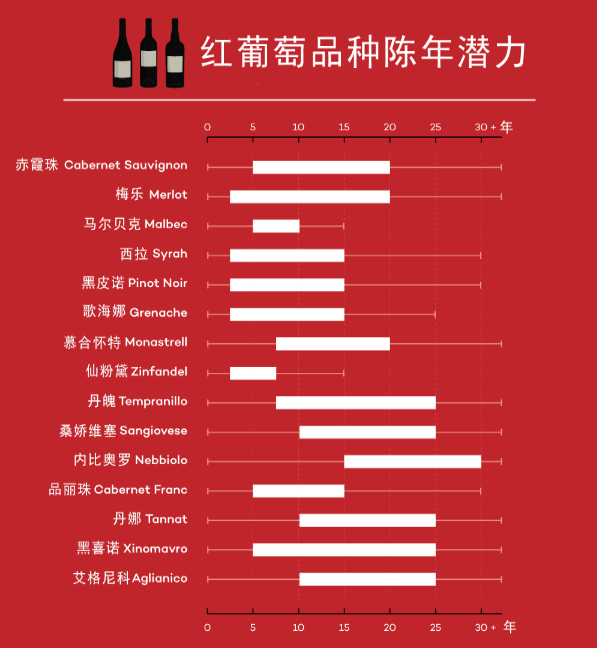 在此之上,不同葡萄品种陈年潜力有差异。专业葡萄酒网站 Winefolly 为我们统计了一些主要的葡萄品种,最好在它们的陈酿时间范围内喝: