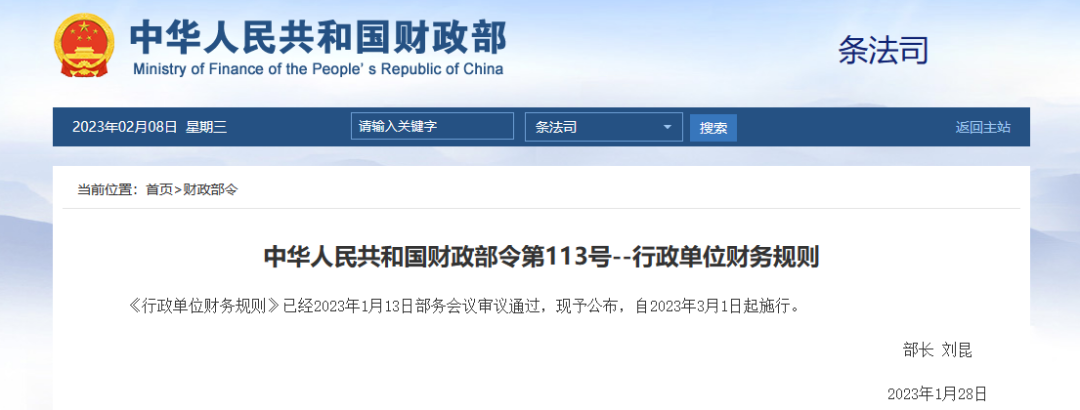 《行政单位财务规则》已经2023年1月13日部务会议审议通过,现予公布,自2023年3月1日起施行。 部长 刘昆