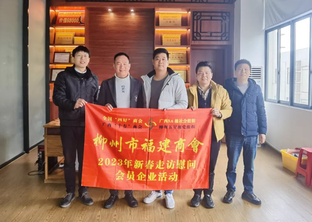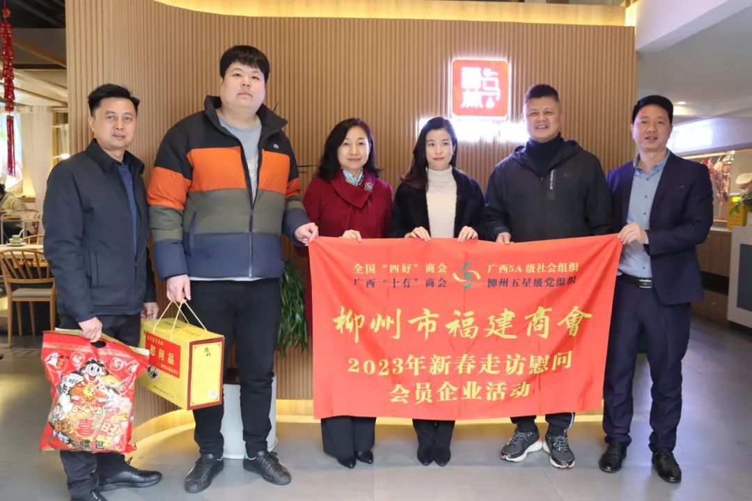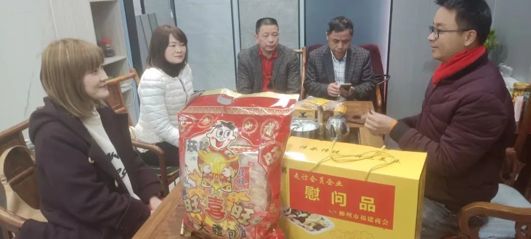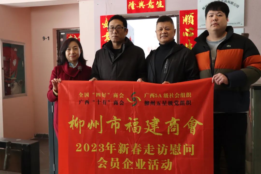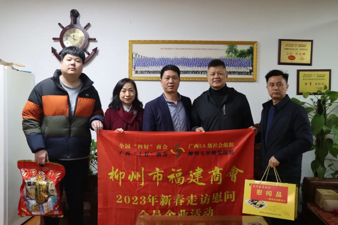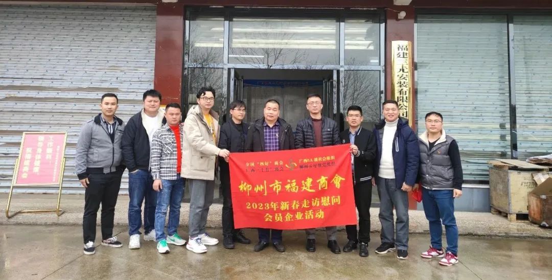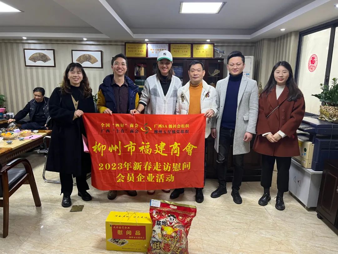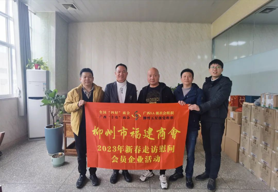 2023年2月8日,今年立春后的第五天,柳州城内外依然寒风凛冽,细雨绵绵,自然天气没有给人们带来一丝春天的气息。然而,在柳州市福建商会,上下却荡漾着春天的温暖。因为当天一大早,商会会长黄志荣、常务执行会长苏报谷、监事长郭炳林、党支部书记陈玉坤、第一书记梁西金、执行会长周庄顶、陈明凉、游品俤、总顾问傅志良等领导就带领商会34名副会长以上领导和柳州兴业银行、柳州桂林银行有关领导13人,共47人,穿上羽绒服、打着雨伞,带着旺旺大礼包和腐竹等慰问品,兵分8路,奔赴柳州市四面八方走访慰问会员企业,给会员送去了关爱和温暖,受到了会员们的热烈欢迎。本文开头的几句打油诗,正是当天商会领导新春走访会员企业活动的生动写照。