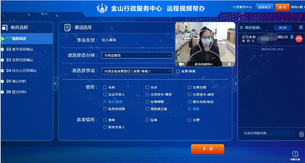 目前,金山区“远程视频帮办”已推出包括内资企业变更登记、增补发营业执照、农民专业合作社变更登记等在内的26个事项的线上帮办。除了工作人员日常帮办外,金山区政务服务中心还上下联动,开展“领导帮办”活动,坚持倾听企业和群众的诉求,有求必应。