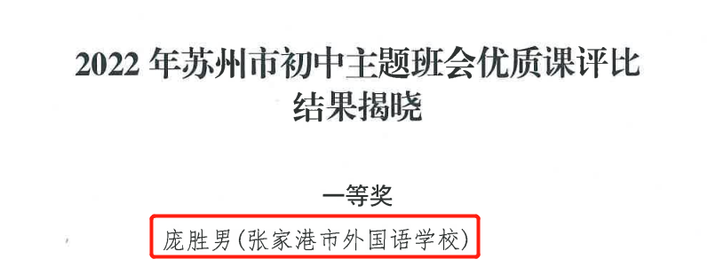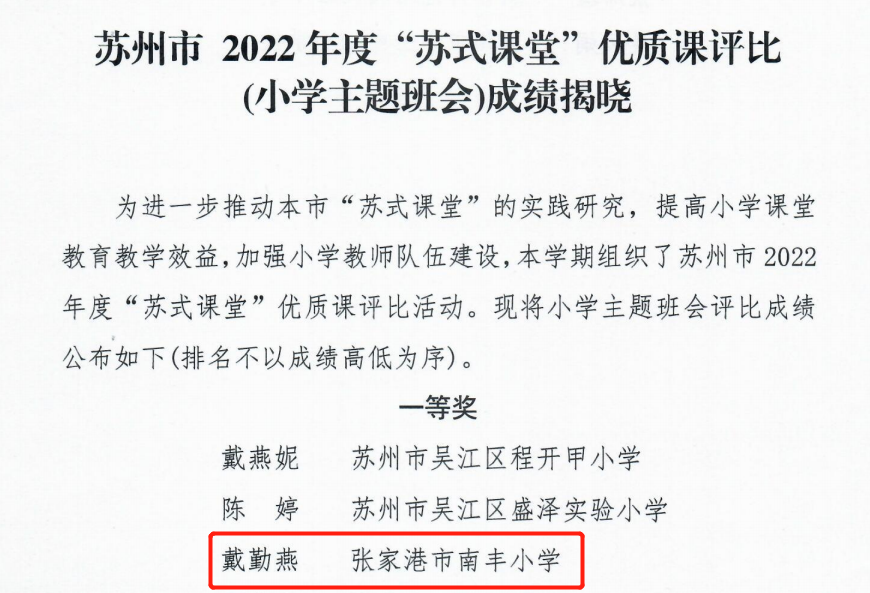 近日,苏州市教育科学研究院公布了2022年度“苏式课堂”优质课评比(小学主题班会)成绩和2022年苏州市初中主题班会优质课评比结果,我市南丰小学戴勤燕老师和外国语学校庞胜男老师分别获得一等奖!