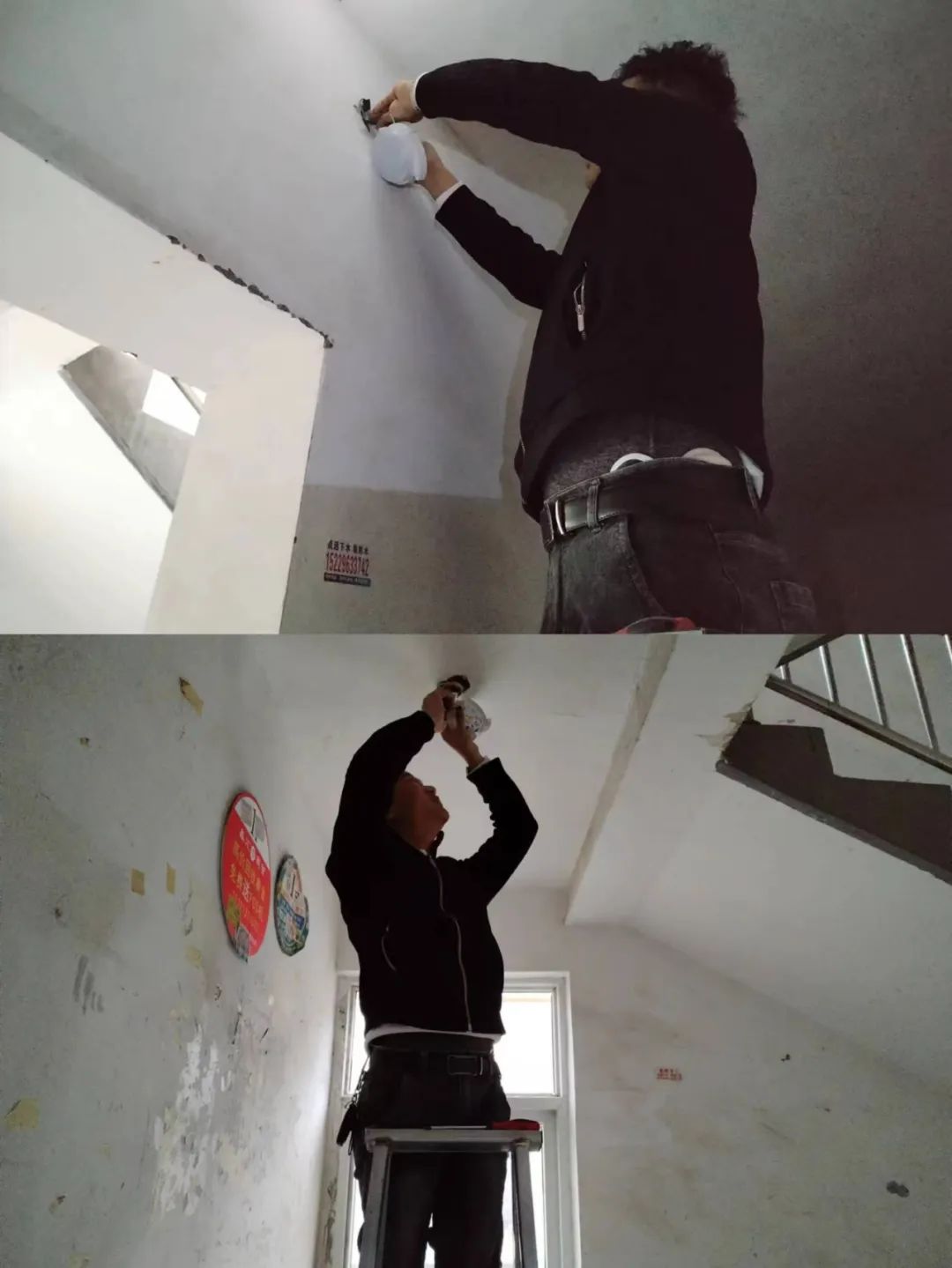 城市嘉园小区物业工作人员更换7号楼、14号楼楼道破损的灯具。