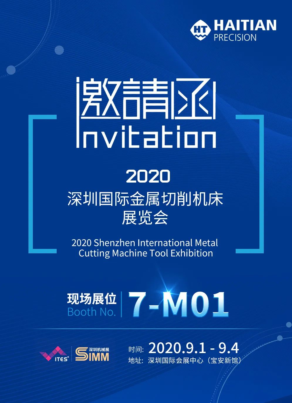 9月1日—4日,2020深圳国际金属切削机床展览会将在深圳国际会展中心盛大举办。本届展会以“新焦点·新思想·新未来——5G 驱动,医疗赋能”为主题,展示工业制造全产业链数字化、智能化、个性化的创新技术及解决方案。海天精工展位号7-M01,期待您莅临参观!