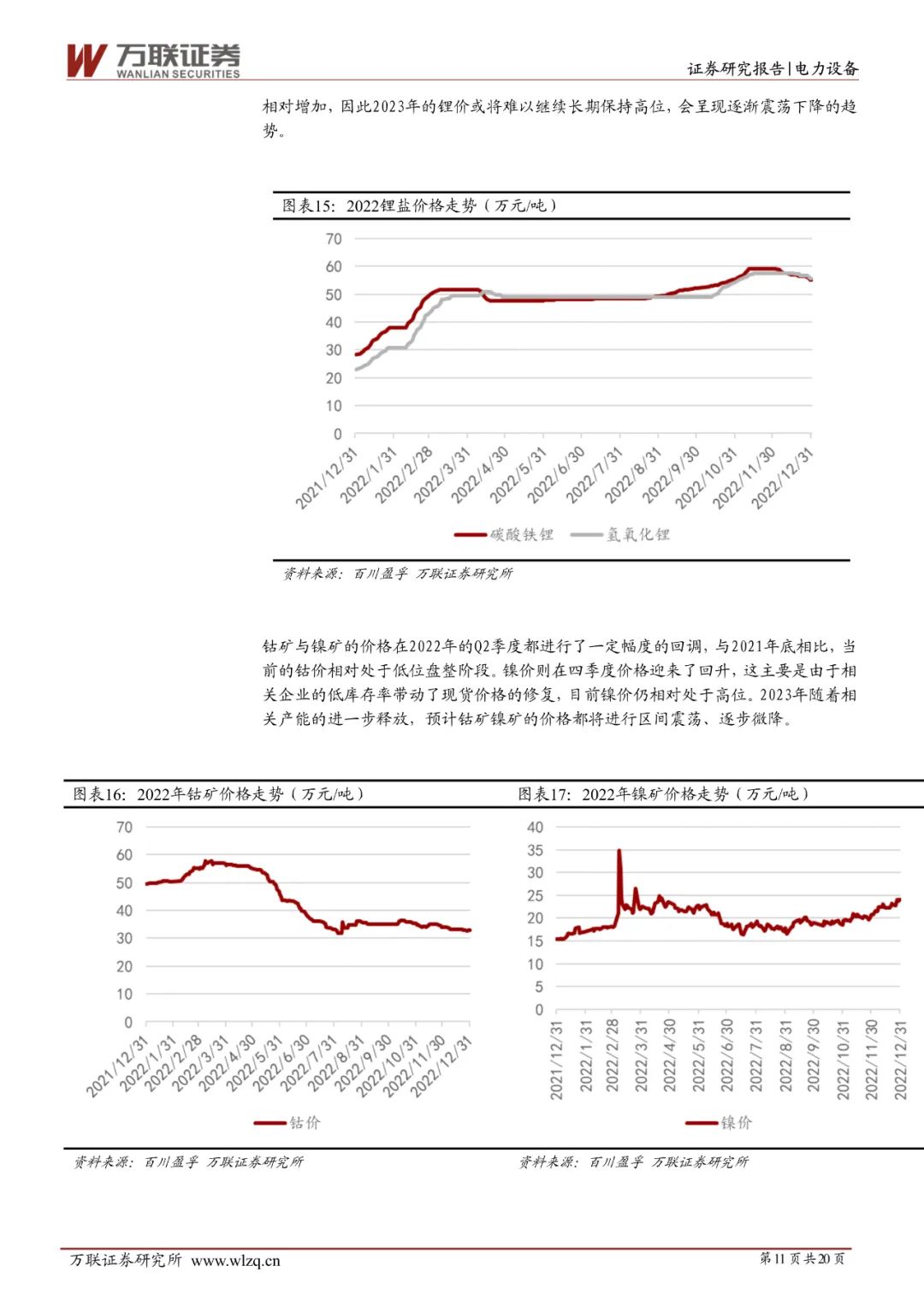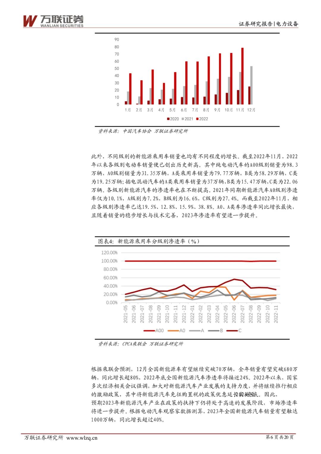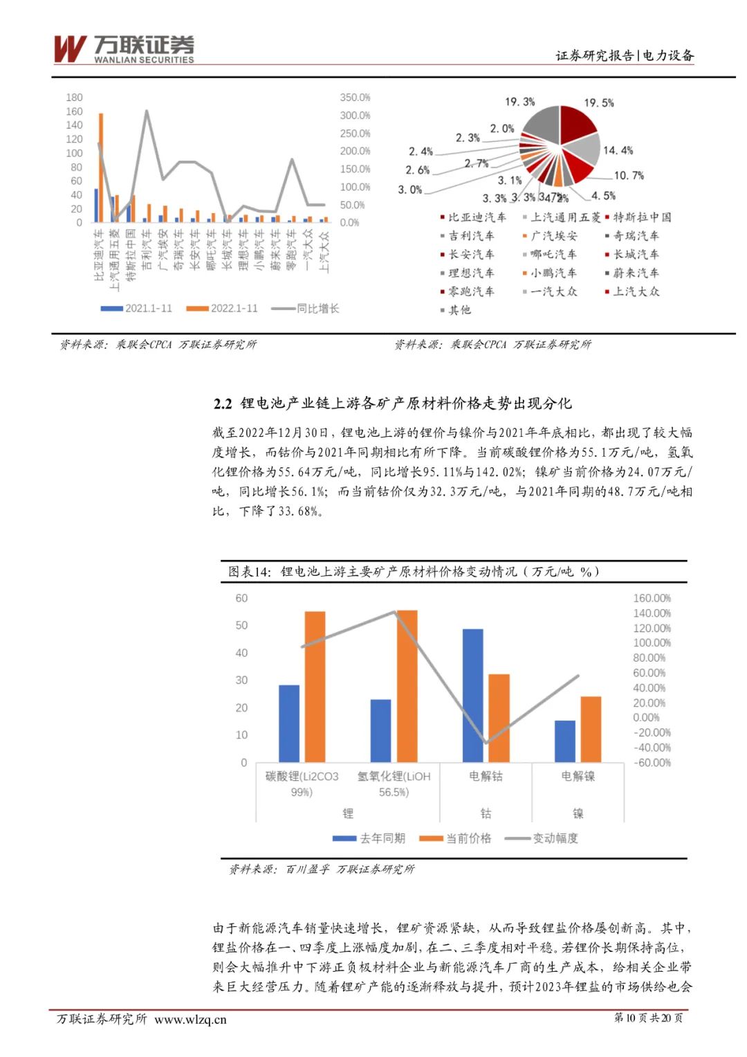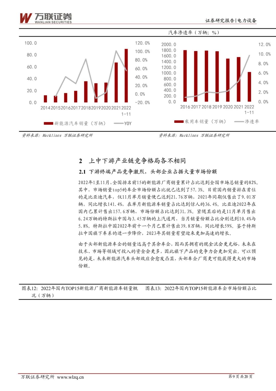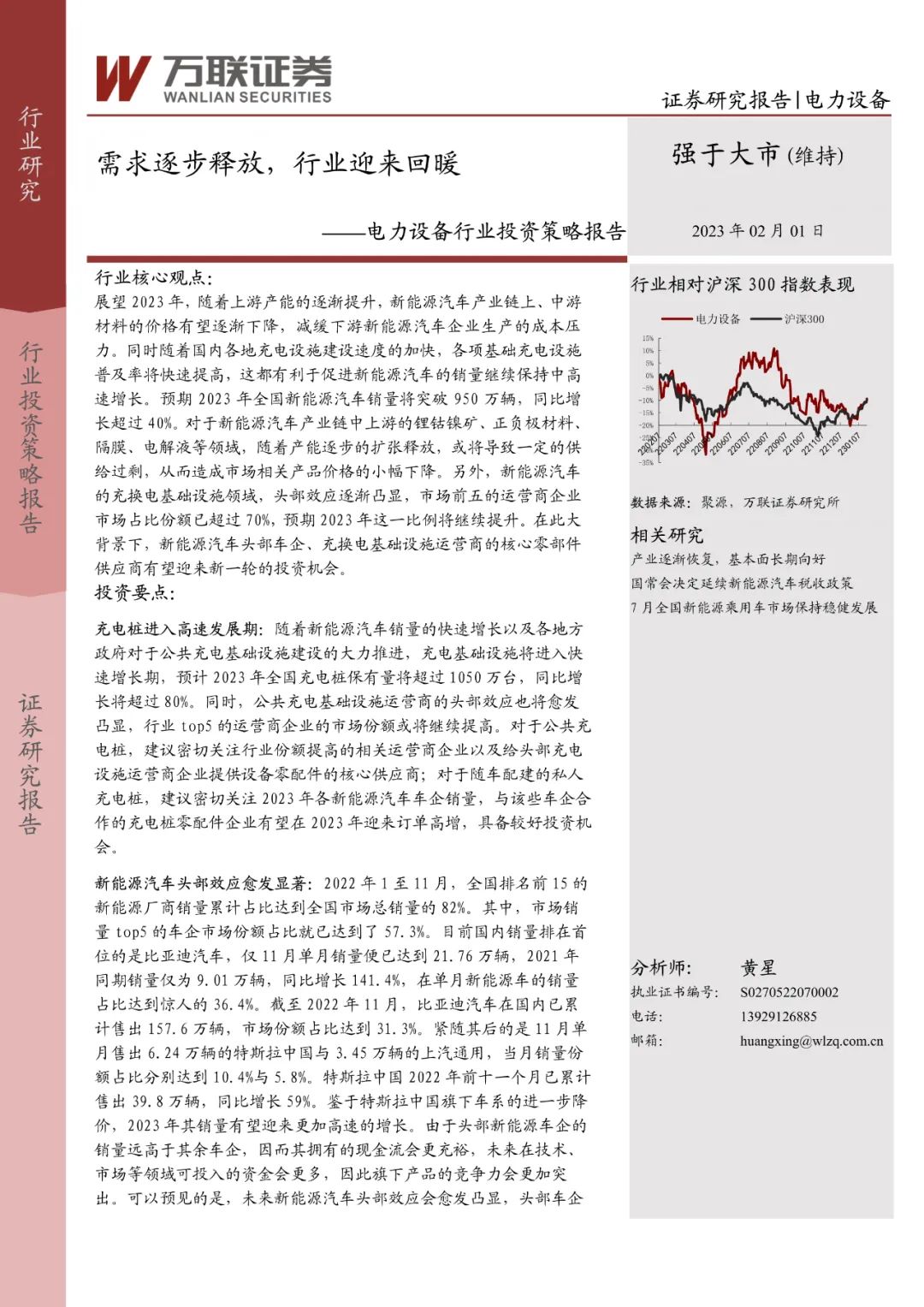 展望 2023 年,随着上游产能的逐渐提升,新能源汽车产业链上、中游材料的价格有望逐渐下降,减缓下游新能源汽车企业生产的成本压力。同时随着国内各地充电设施建设速度的加快,各项基础充电设施普及率将快速提高,这都有利于促进新能源汽车的销量继续保持中高速增长。预期 2023 年全国新能源汽车销量将突破 950 万辆,同比增长超过 40%。对于新能源汽车产业链中上游的锂钴镍矿、正负极材料、隔膜、电解液等领域,随着产能逐步的扩张释放,或将导致一定的供给过剩,从而造成市场相关产品价格的小幅下降。另外,新能源汽车的充换电基础设施领域,头部效应逐渐凸显,市场前五的运营商企业市场占比份额已超过 70%,预期 2023 年这一比例将继续提升。在此大背景下,新能源汽车头部车企、充换电基础设施运营商的核心零部件供应商有望迎来新一轮的投资机会。