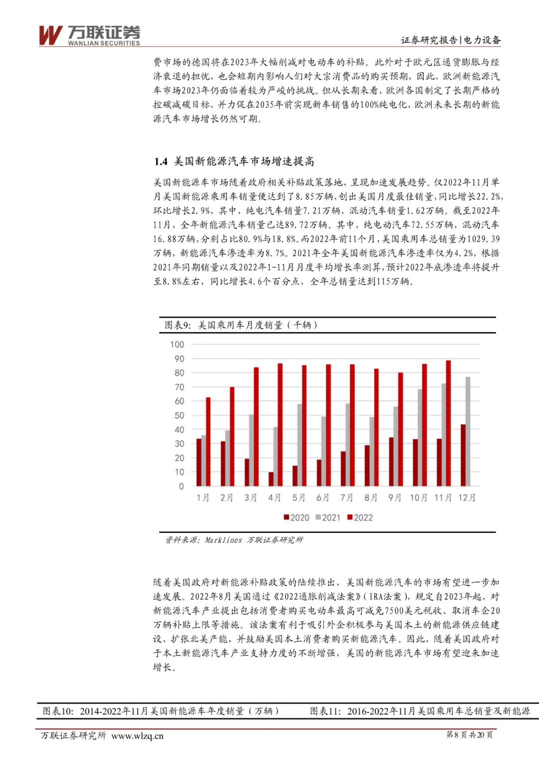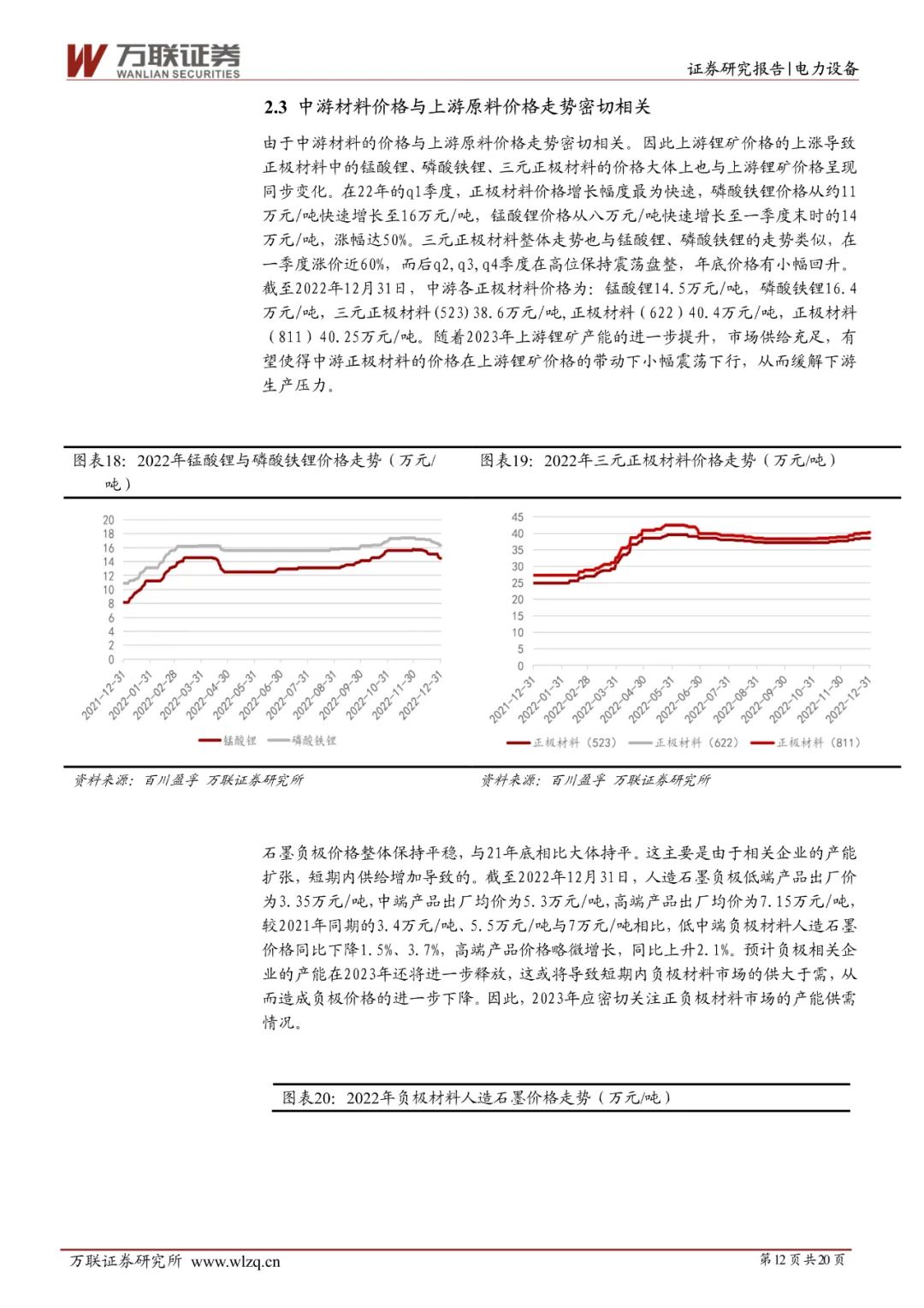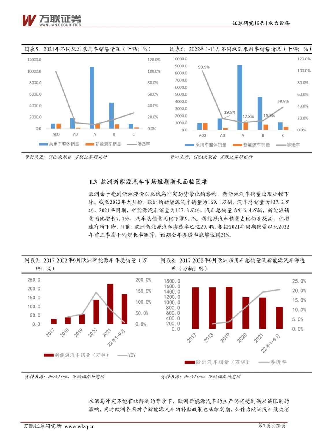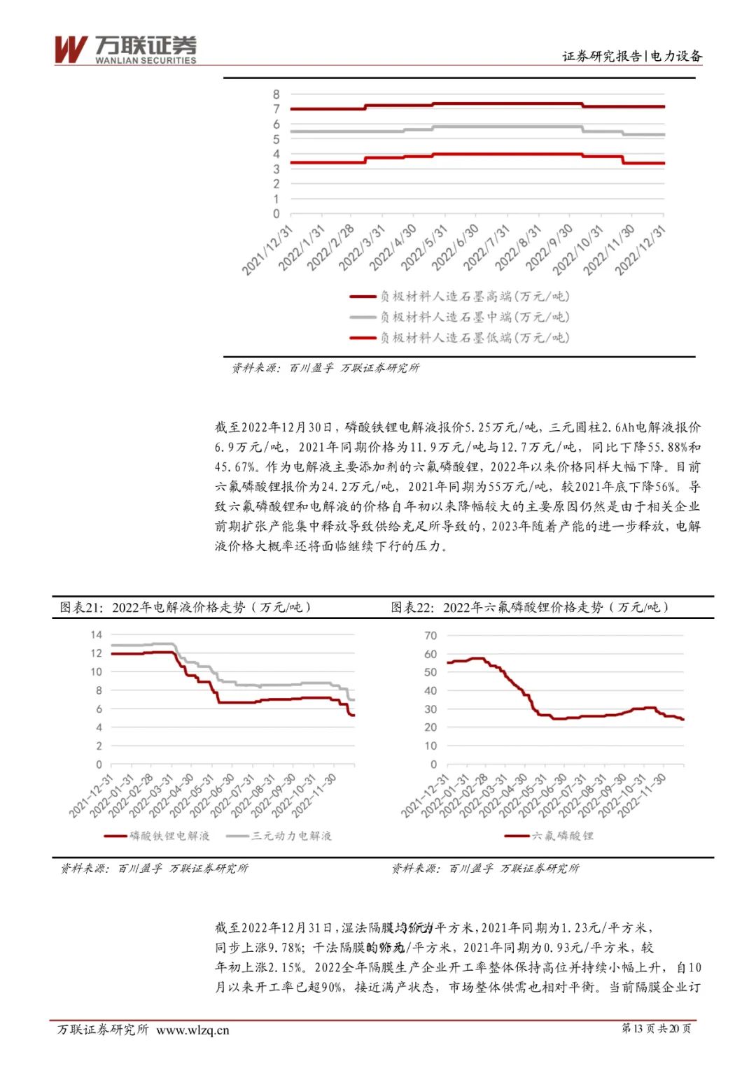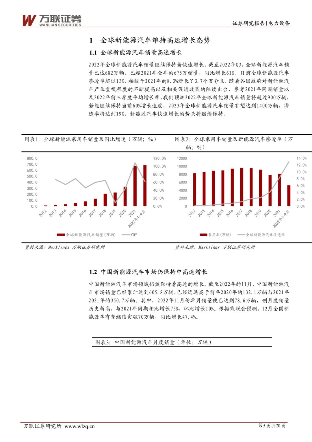 展望 2023 年,随着上游产能的逐渐提升,新能源汽车产业链上、中游材料的价格有望逐渐下降,减缓下游新能源汽车企业生产的成本压力。同时随着国内各地充电设施建设速度的加快,各项基础充电设施普及率将快速提高,这都有利于促进新能源汽车的销量继续保持中高速增长。预期 2023 年全国新能源汽车销量将突破 950 万辆,同比增长超过 40%。对于新能源汽车产业链中上游的锂钴镍矿、正负极材料、隔膜、电解液等领域,随着产能逐步的扩张释放,或将导致一定的供给过剩,从而造成市场相关产品价格的小幅下降。另外,新能源汽车的充换电基础设施领域,头部效应逐渐凸显,市场前五的运营商企业市场占比份额已超过 70%,预期 2023 年这一比例将继续提升。在此大背景下,新能源汽车头部车企、充换电基础设施运营商的核心零部件供应商有望迎来新一轮的投资机会。