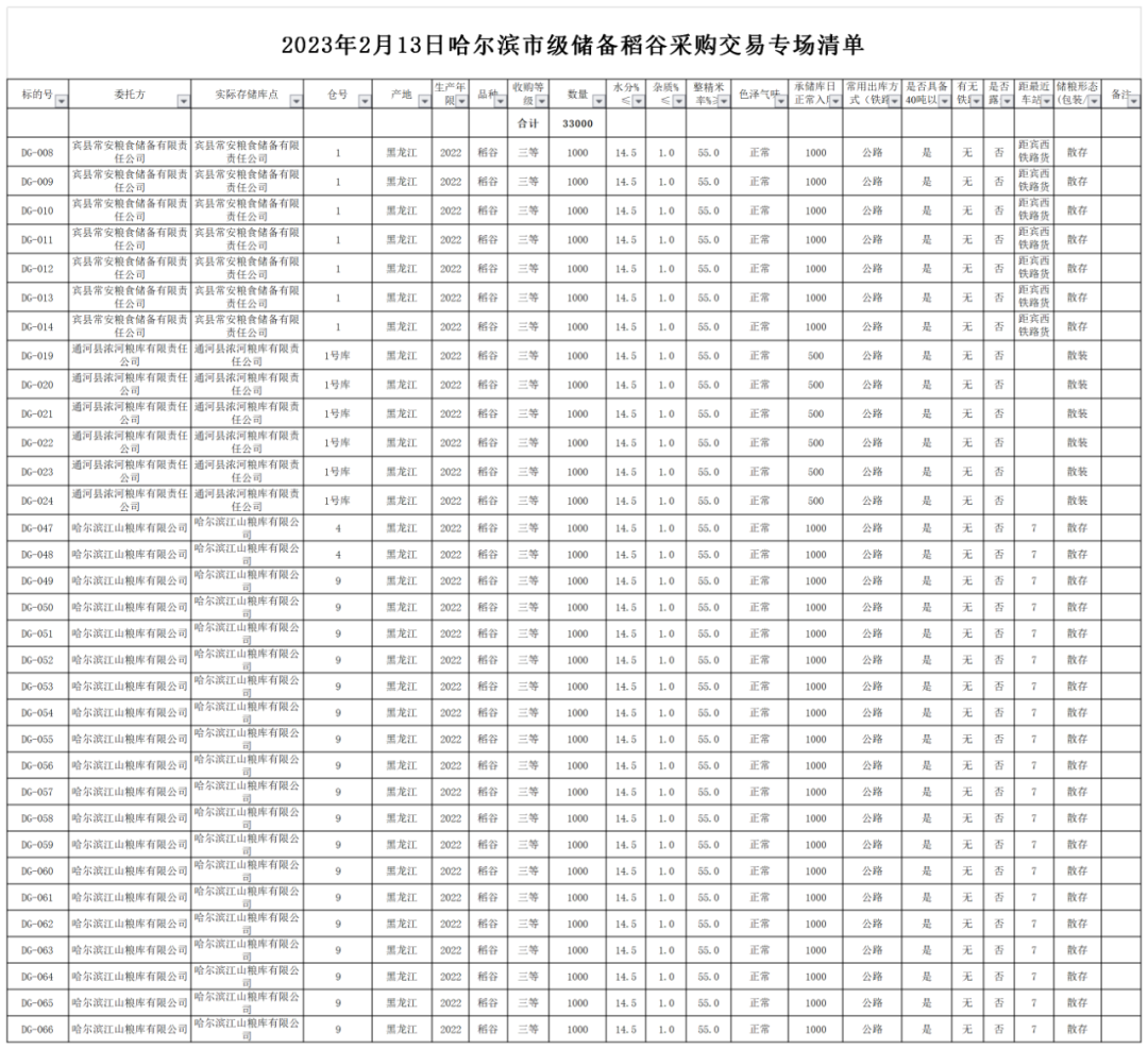 2023年2月13日【10:00】哈尔滨市级储备粮(稻谷)竞价采购交易清单