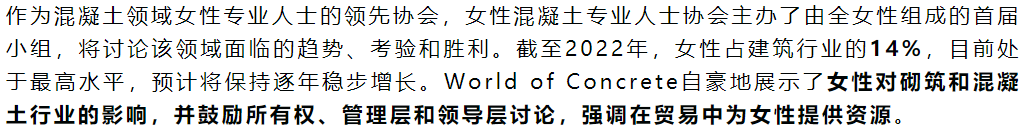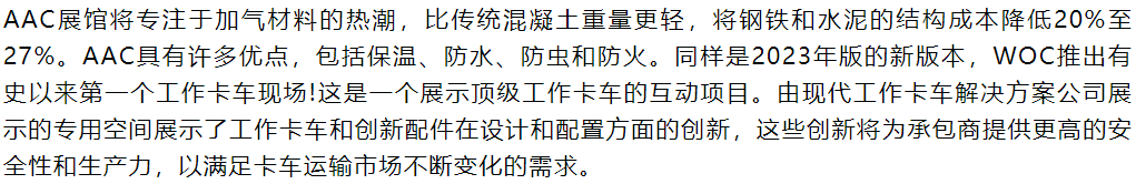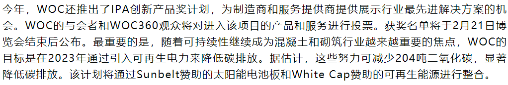 本届WOC美国混凝土世界博览会,吸引了来自全球的1000多家混凝土及砌筑展商参展,占地超过70万平方英尺的室内和室外展览空间,展会期间有大量专业观众到场参观。展会副总裁Jackie James说:“随着全球社会继续寻求生产、材料和市场趋势,WOC美国混凝土世界博览会是混凝土和砌筑行业增长的主要来源之一。”“今年欢迎一系列有意推出的新举措,这些举措将在材料创新、卡车运输业的增长和公认的持续对社区产生影响的领域取得进步。”