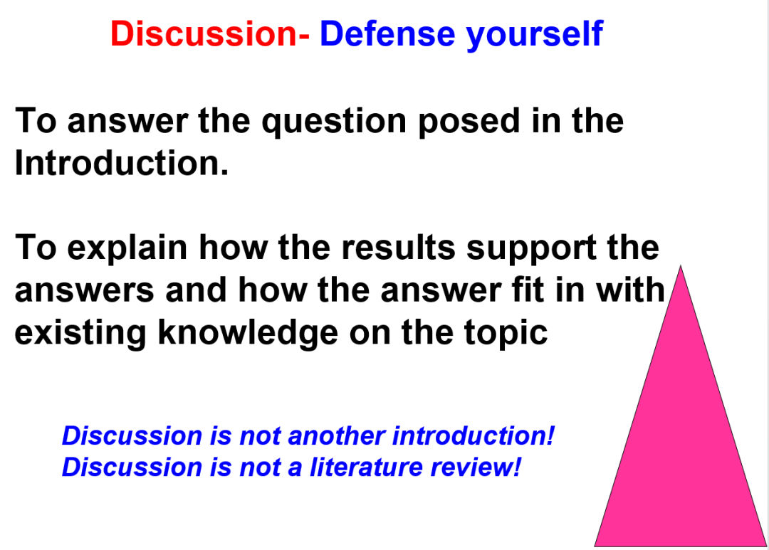 Discussion(讨论):“除前言外,我个人认为讨论是英文论文最难写的部分”。与前言部分呈“由宽变窄” 的倒金字塔形正好相反,讨论部分是“由窄变宽”的金字塔形(图3)。讨论不是另一个前言,也不能成为一般综述。