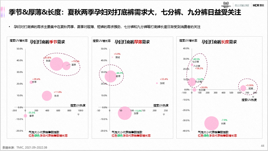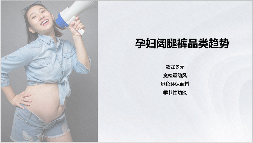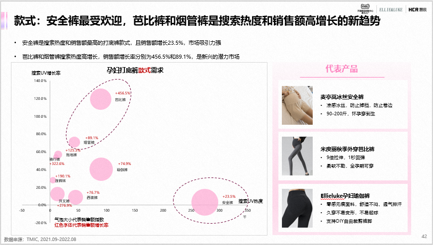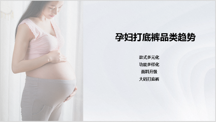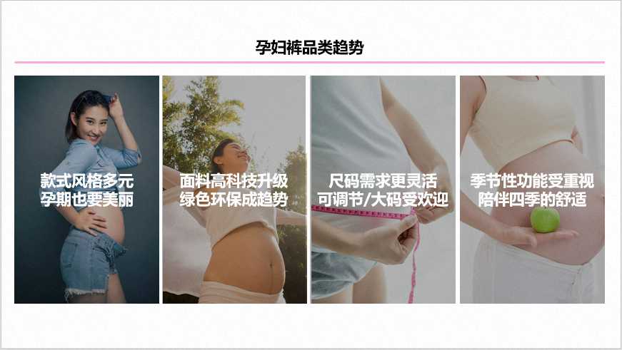 孕裤装中打底裤是主流,孕妇阔腿裤和直筒裤是销售额增长的趋势品类。孕妇打底裤中安全裤是搜索热度最高的款式,市场吸引力强;款式多元化、功能多元化、面料升级和大码打底裤是孕妇打底裤品类市场的主要需求。