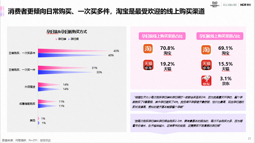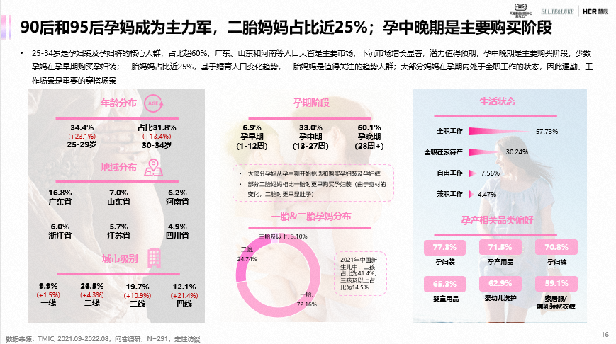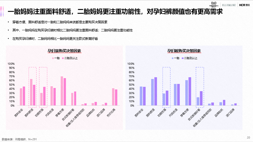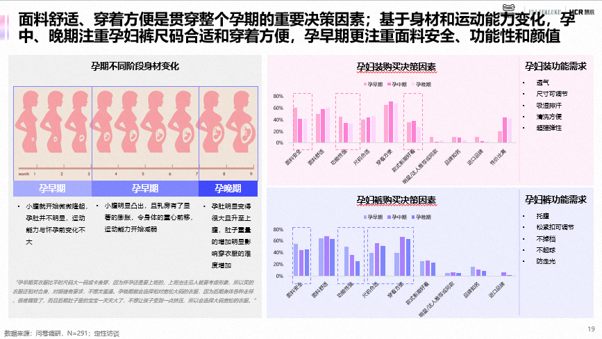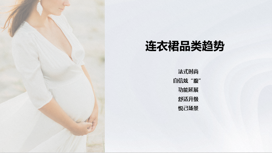 25-34岁是孕妇装及孕妇裤的核心人群,占比超60%;二胎妈妈占比近25%,是值得关注的趋势人群;二胎妈妈相比头胎时,消费能力的提升和悦己态度的增强花费更多。连衣裙、T恤、和套装是孕妇装主要购买品类,打底裤和阔腿裤是孕妇裤主要购买品类;面料舒适、穿着方便是贯穿整个孕期的重要决策因素;基于身材和运动能力变化,孕中、晚期注重尺码合适和穿着方便,早期则注重面料安全、功能性和颜值。